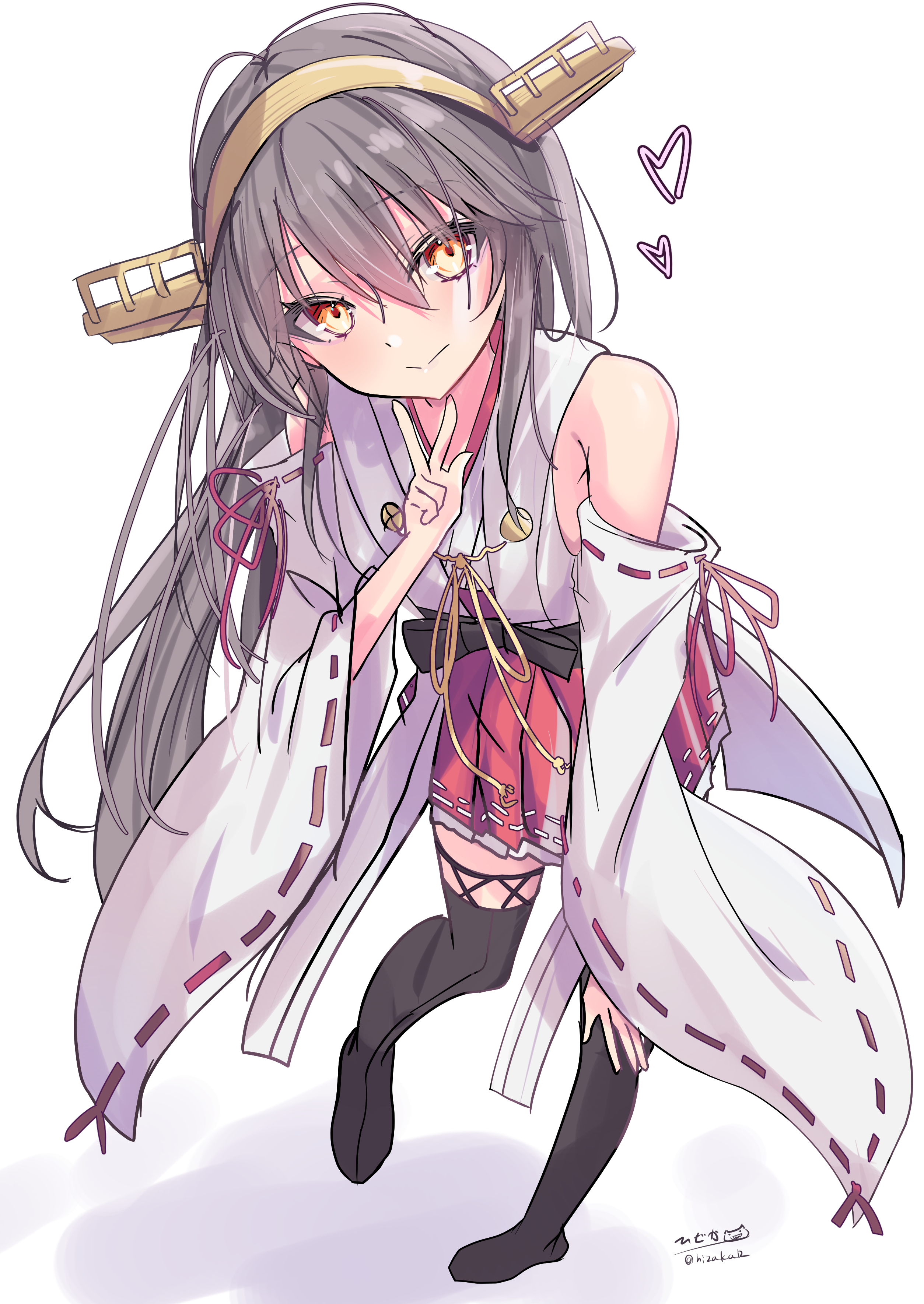 1girl absurdres bare_shoulders black_hair blush boots breasts brown_eyes detached_sleeves full_body hair_between_eyes hair_ornament hairband hairclip hakama hakama_short_skirt hakama_skirt haruna_(kancolle) haruna_kai_ni_(kancolle) headgear heart highres hizaka japanese_clothes kantai_collection long_hair looking_at_viewer nontraditional_miko one-hour_drawing_challenge ribbon-trimmed_sleeves ribbon_trim signature skirt smile solo thigh_boots thighhighs twitter_username white_background