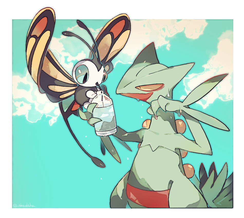 1other akadako arms_up artist_name bags_under_eyes beautifly black_eyes blue_background blue_sclera blue_sky border bottle bug butterfly closed_mouth cloud colored_sclera colored_skin day drinking gen_3_pokemon green_skin holding holding_bottle hot insect multicolored_skin nintendo other_focus outdoors outline outside_border pokemon pokemon_(creature) red_skin sceptile signature sky standing sweat twitter_username two-tone_skin water_bottle white_border yellow_sclera