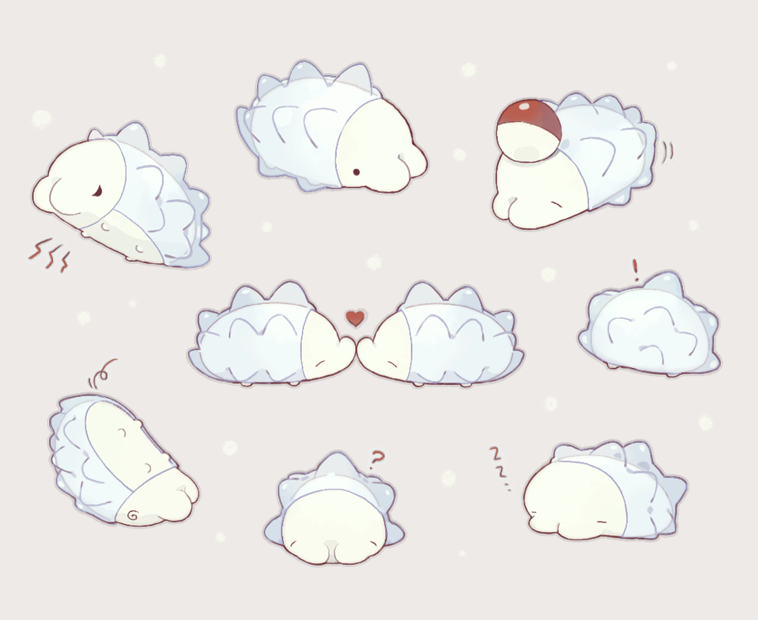 ! ._. =_= ? @_@ ^_^ akadako animal_focus black_eyes closed_eyes facing_away from_behind from_side gen_8_pokemon grey_background grey_outline half-closed_eyes happy heart kiss lying multiple_views nintendo no_humans object_on_head on_back outline poke_ball poke_ball_(basic) pokemon pokemon_(creature) profile simple_background sleeping snom straight-on zzz