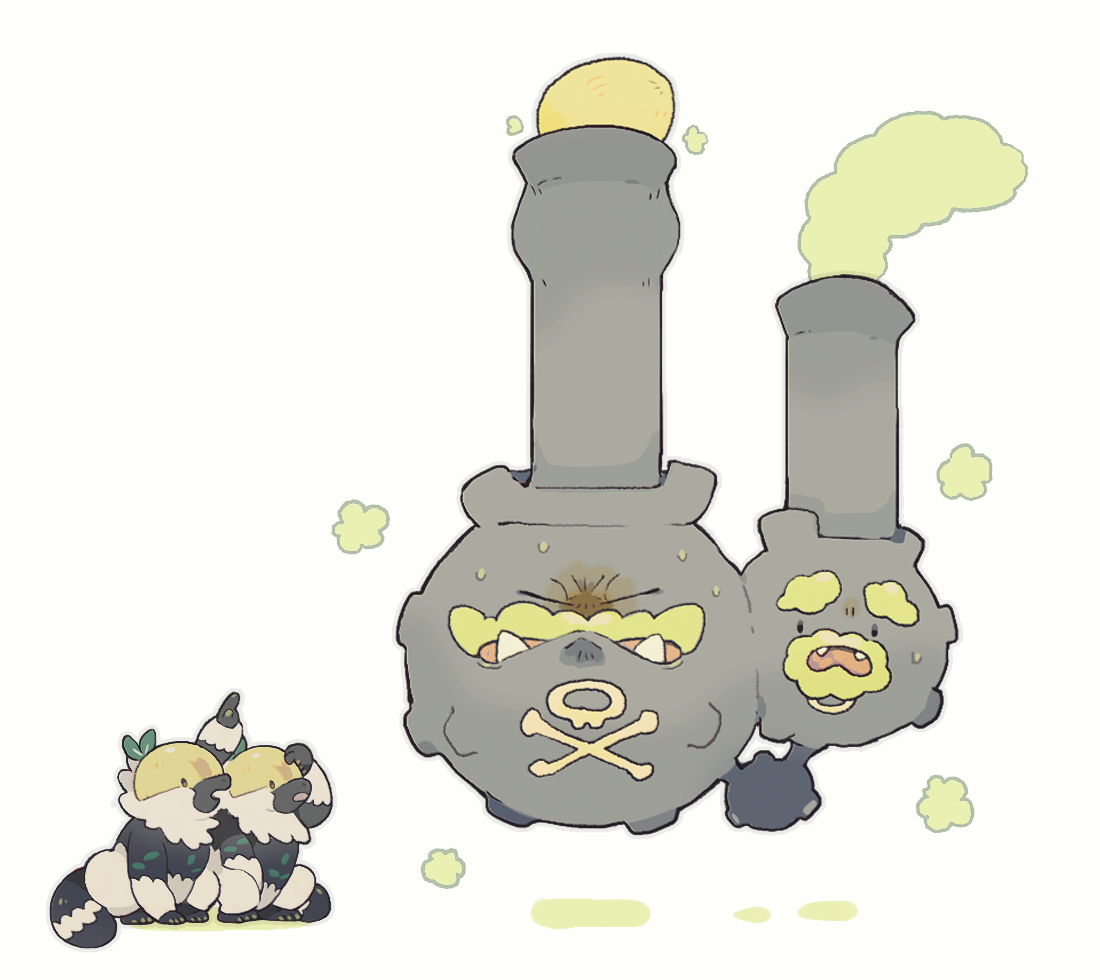 2others akadako black_eyes closed_eyes coconut facing_viewer fangs fangs_out floating full_body furrowed_brow furry galarian_form galarian_weezing gen_7_pokemon gen_8_pokemon grey_outline looking_up multiple_heads multiple_others nintendo outline passimian pointing pokemon pokemon_(creature) scratching_head simple_background smoke straight-on sweat white_background