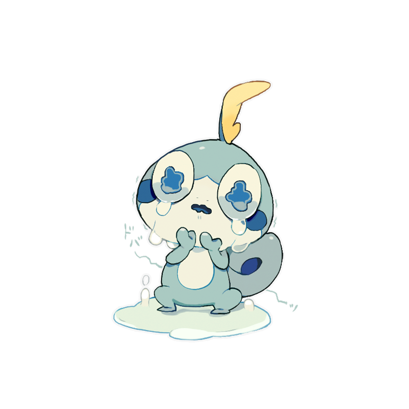 akadako animal_focus blue_eyes blush_stickers crying full_body gen_8_pokemon hands_up japanese_text looking_at_viewer nintendo no_humans open_mouth pokemon pokemon_(creature) puddle sad simple_background sobble solo standing tears translation_request trembling wavy_eyes wavy_mouth white_background wide-eyed
