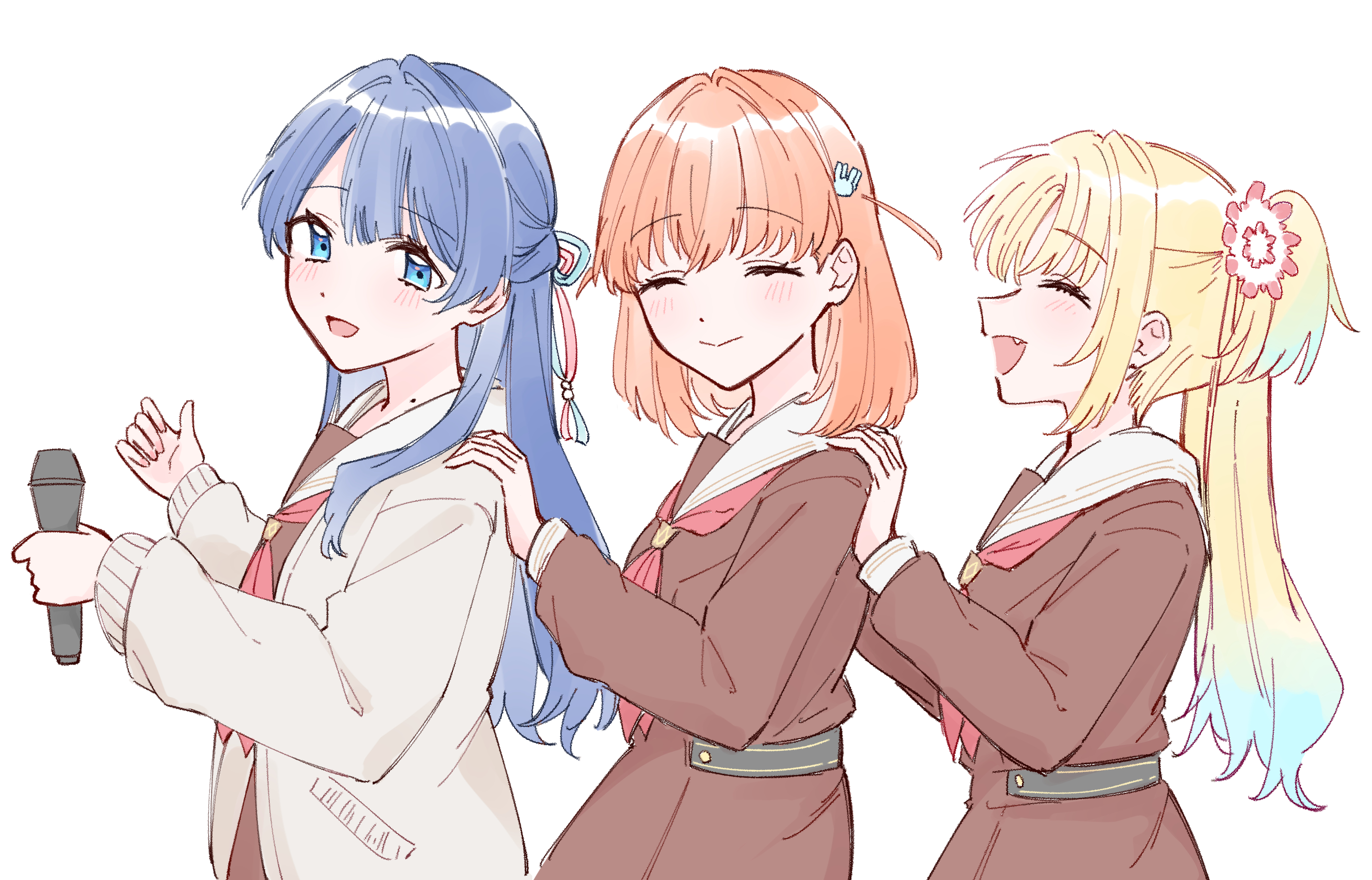 3girls :d ^_^ blonde_hair blue_eyes blue_hair blue_ribbon blush brown_dress cardigan closed_eyes commentary dress fang flower grey_cardigan hair_flower hair_ornament hair_ribbon half_updo hands_on_another's_shoulders hasu_no_sora_school_uniform highres hinoshita_kaho holding holding_microphone karaoke_hasu_no_sora link!_like!_love_live! long_hair long_sleeves love_it!_wonderful_trip! love_live! medium_hair microphone mole mole_on_neck multiple_girls murano_sayaka neckerchief open_cardigan open_clothes open_mouth orange_hair osawa_rurino pink_flower profile rabbit_hair_ornament red_neckerchief red_ribbon ribbon sailor_collar sailor_dress school_uniform simple_background smile twintails two_side_up virtual_youtuber white_background white_sailor_collar winter_uniform zangemiya