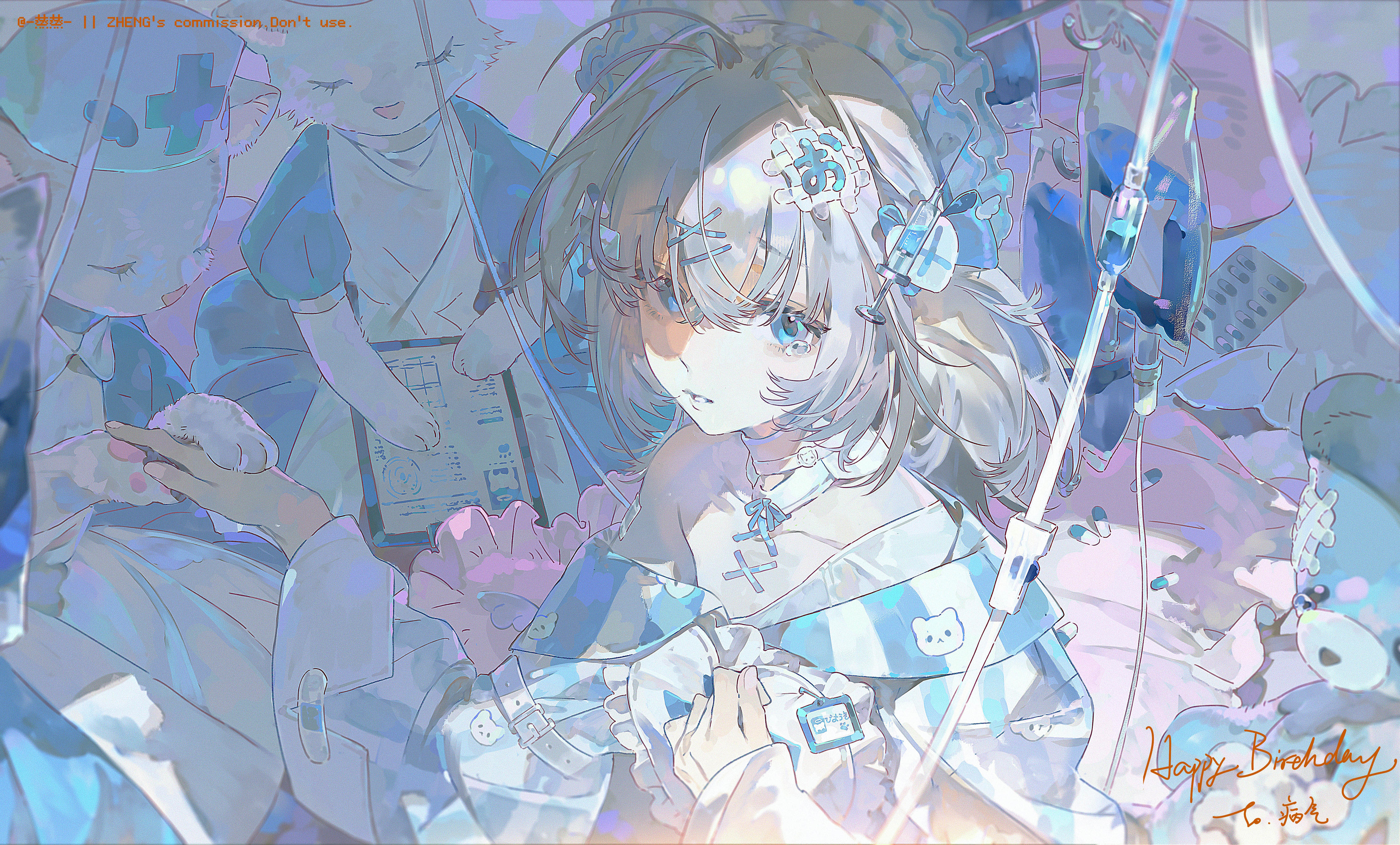 3girls absurdres bare_shoulders blue_eyes cat_girl commission dress furry furry_female grey_hair hair_ornament hairclip headdress highres multiple_girls original solo_focus striped_clothes striped_dress tearing_up teeth upper_body w_zhengz watermark x_hair_ornament