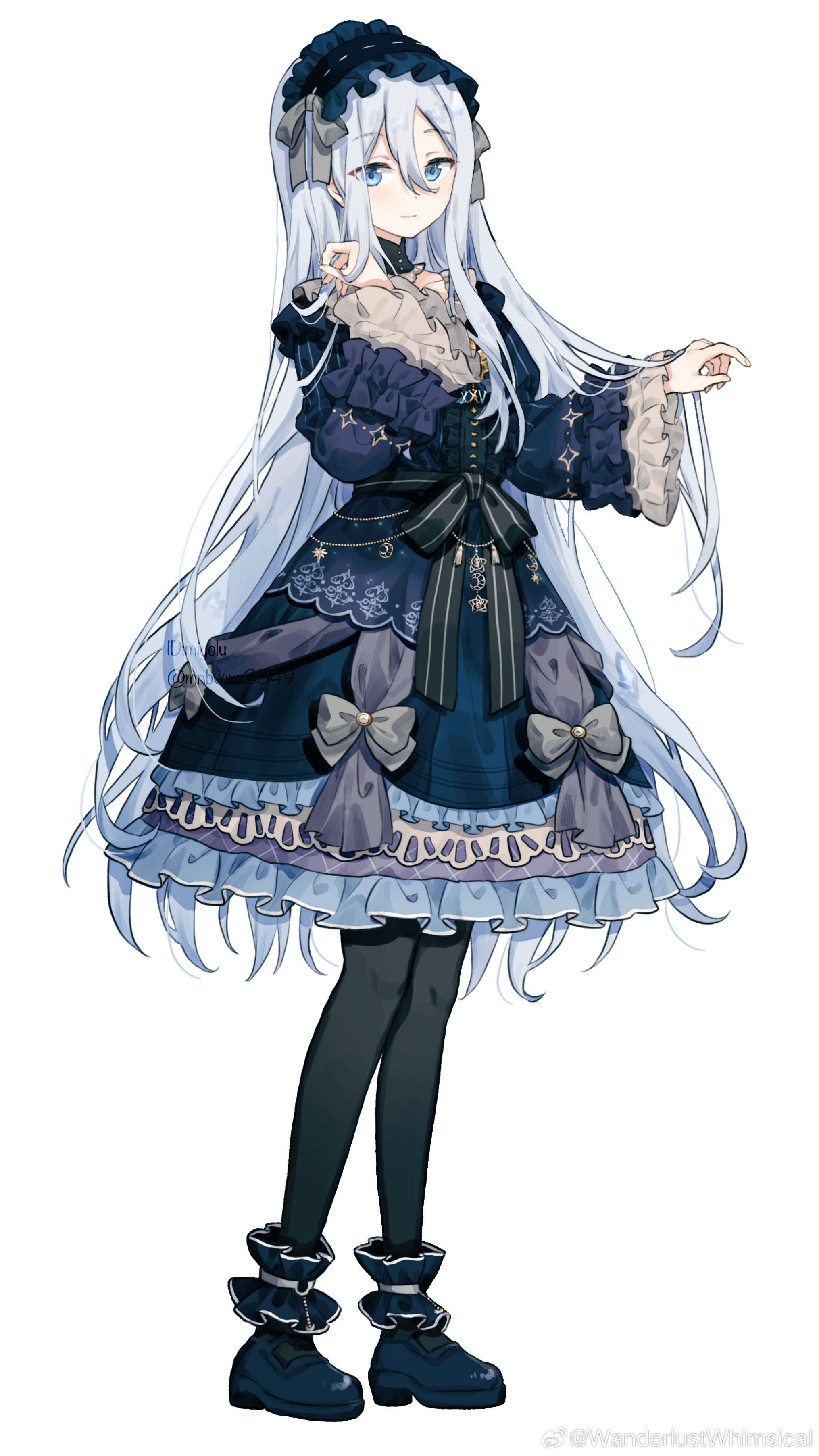 1girl absurdres black_bow black_pantyhose black_sash blue_eyes bow chinese_commentary commentary_request dress frilled_dress frilled_footwear frilled_hairband frilled_sleeves frills full_body gothic_lolita grey_bow grey_dress grey_hair hair_between_eyes hairband highres lolita_fashion long_hair long_sidelocks looking_at_viewer migolu minasoko_ni_kage_wo_sagashite_(project_sekai) official_alternate_costume pantyhose project_sekai sash sidelocks simple_background smile solo standing very_long_hair watermark weibo_watermark white_background wide_sleeves yoisaki_kanade