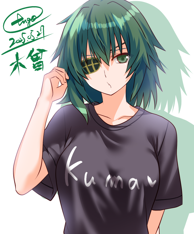 1girl black_shirt character_name dated engo_(aquawatery) eyepatch green_eyes green_hair kantai_collection kiso_(kancolle) kiso_kai_ni_(kancolle) one-hour_drawing_challenge shirt short_hair signature simple_background solo t-shirt unworn_clothes upper_body white_background