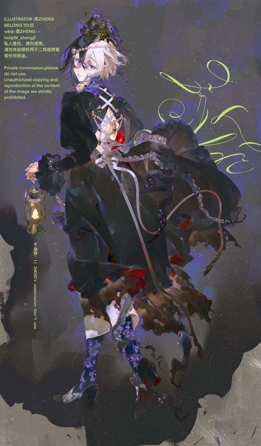 1girl backless_outfit black_dress commission dress english_text full_body happy_birthday highres juliet_sleeves long_sleeves looking_at_viewer original puffy_sleeves short_hair signature solo w_zhengz watermark