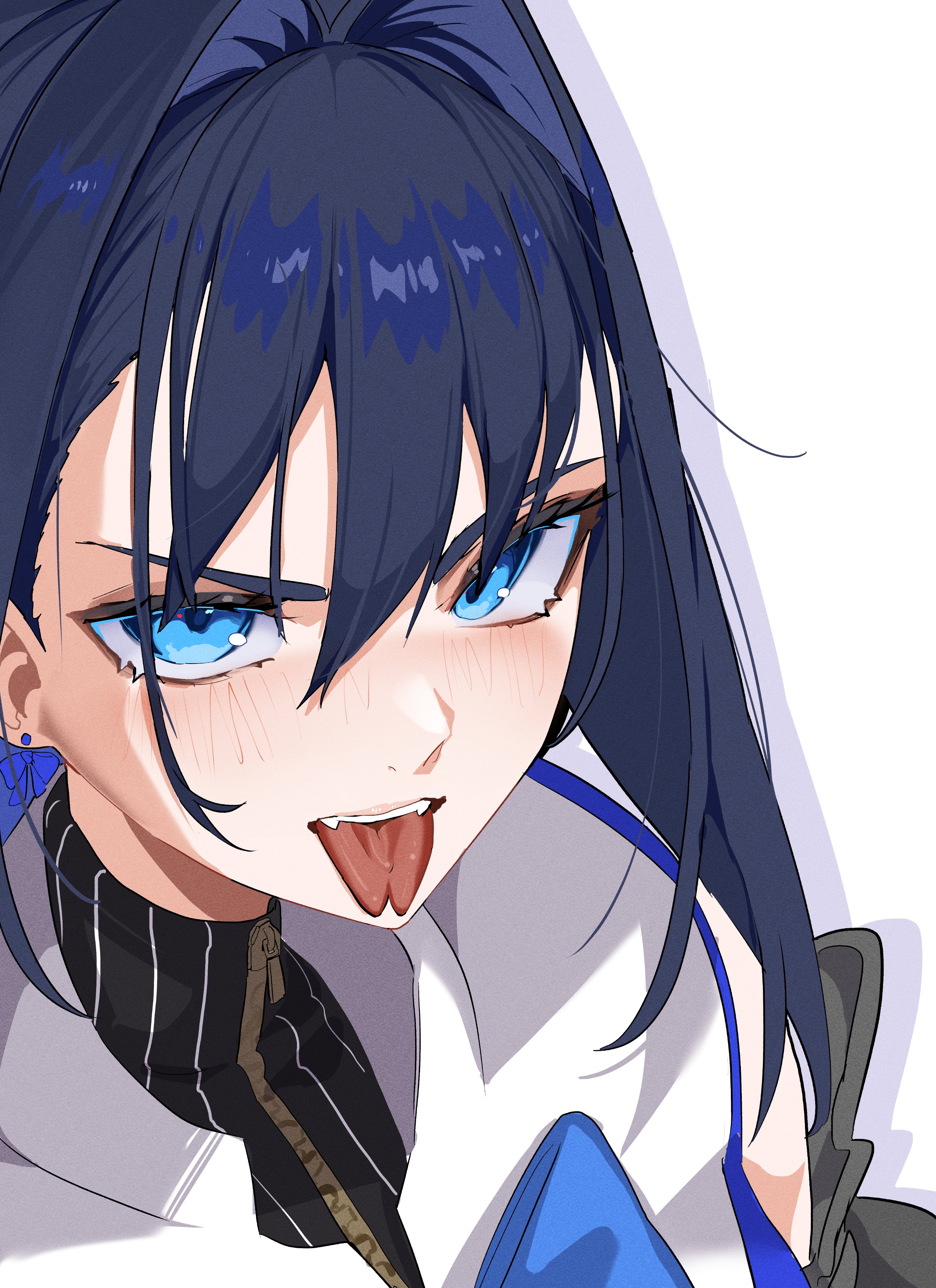 1girl absurdres blue_eyes blue_hair daaku_(koizumi_arata) detached_sleeves drop_shadow fangs forked_tongue hair_intakes highres hololive hololive_english looking_at_viewer ouro_kronii ouro_kronii_(1st_costume) portrait ribbon_earrings sleeveless sleeveless_turtleneck solo tongue tongue_out turtleneck v-shaped_eyebrows virtual_youtuber wispy_bangs