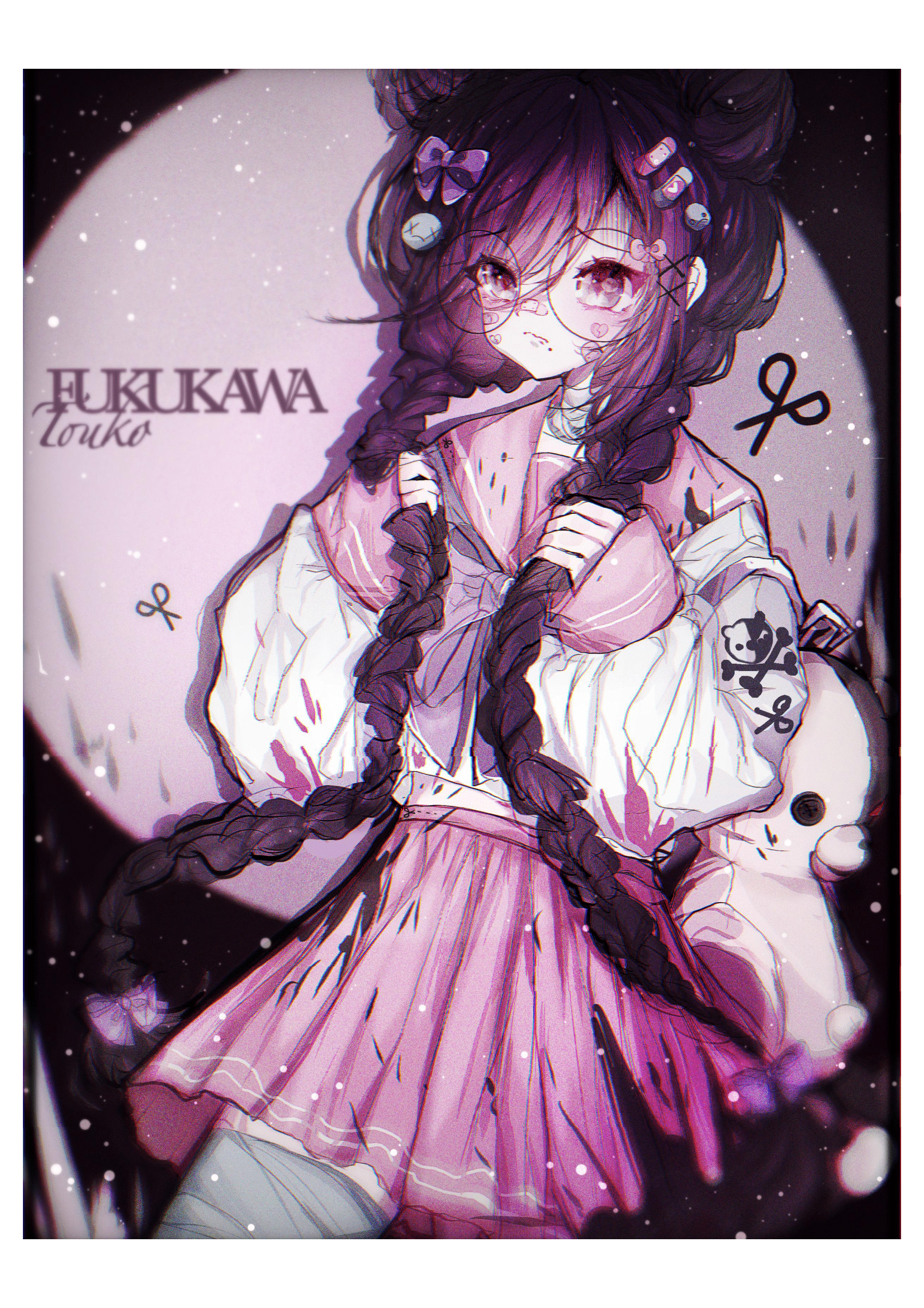 1girl alternate_costume bandaid bandaid_hair_ornament bandaid_on_face bandaid_on_nose blood blood_splatter border bow braid character_name chromatic_aberration closed_mouth danganronpa:_trigger_happy_havoc danganronpa_(series) eyelashes fukawa_toko glasses hair_bow hair_ornament highres holding holding_own_hair long_hair long_sleeves mole mole_under_mouth monokuma non-web_source pink_blood pink_sailor_collar pink_skirt purple_bow purple_eyes purple_hair round_eyewear sailor_collar school_uniform scissors serafuku shirt skirt skull_and_crossbones solo stuffed_toy twin_braids twintails umairih white_border white_shirt