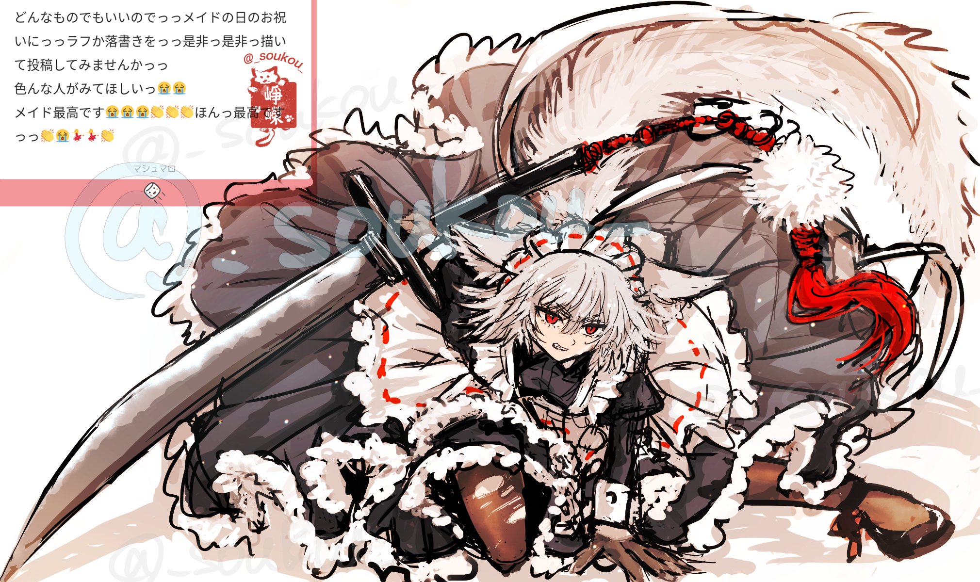 1girl alternate_costume animal_ears black_shoes brown_pantyhose clenched_teeth commentary_request dress ears_down enmaided frilled_dress frills full_body grey_dress grey_hair highres holding holding_sword holding_weapon inubashiri_momiji looking_at_viewer maid maid_headdress pantyhose red_eyes shoes short_hair solo soukou_(sankayou) squatting sword tail teeth touhou translation_request v-shaped_eyebrows weapon wolf_ears wolf_girl wolf_tail