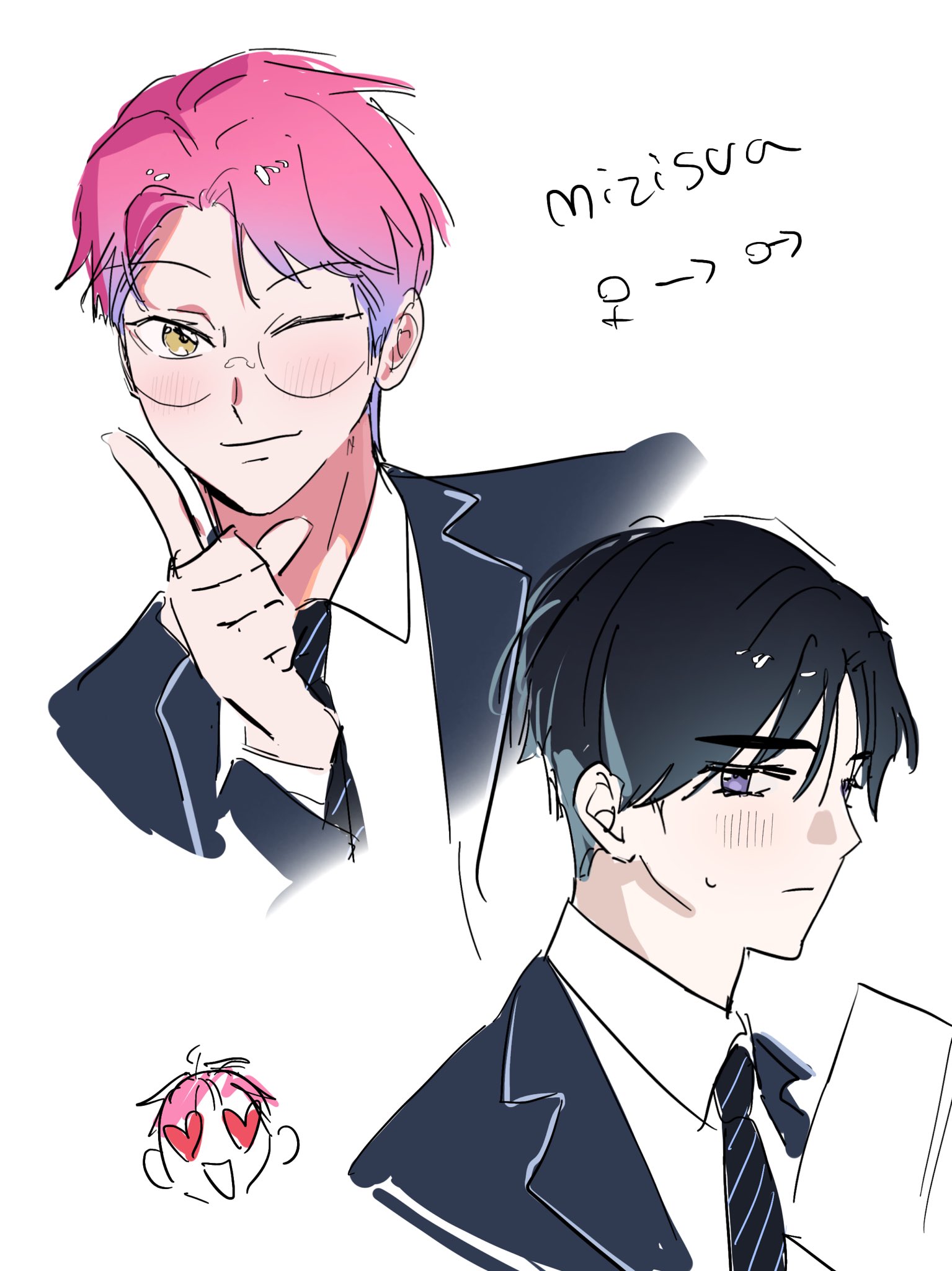 2boys alien_stage black_hair black_jacket black_necktie blue_hair collared_shirt commentary diagonal-striped_clothes diagonal-striped_necktie english_commentary genderswap genderswap_(ftm) glasses heart heart-shaped_eyes highres index_finger_raised jacket male_focus mizi_(alien_stage) multicolored_hair multiple_boys necktie nikuman_0bun official_alternate_costume one_eye_closed pink_hair purple_eyes school_uniform pairing_name shirt short_hair striped_clothes sua_(alien_stage) two-tone_hair uranus_symbol venus_symbol very_short_hair white_shirt yellow_eyes