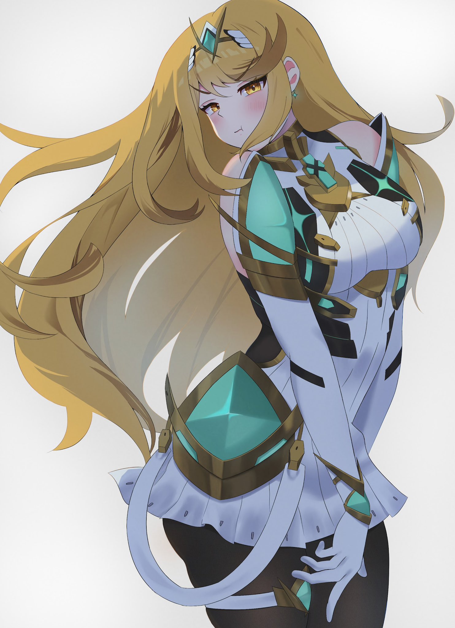 1girl arm_guards ass bare_shoulders black_pantyhose blonde_hair blush breasts chest_jewel dress earrings elbow_gloves exchampion12 floating_earrings gloves half-closed_eyes highres jewelry large_breasts long_hair microdress mythra_(massive_melee)_(xenoblade) mythra_(xenoblade) neon_trim pantyhose pout suspenders swept_bangs thigh_strap tiara v-shaped_eyebrows very_long_hair white_dress white_gloves xenoblade_chronicles_(series) xenoblade_chronicles_2 yellow_eyes