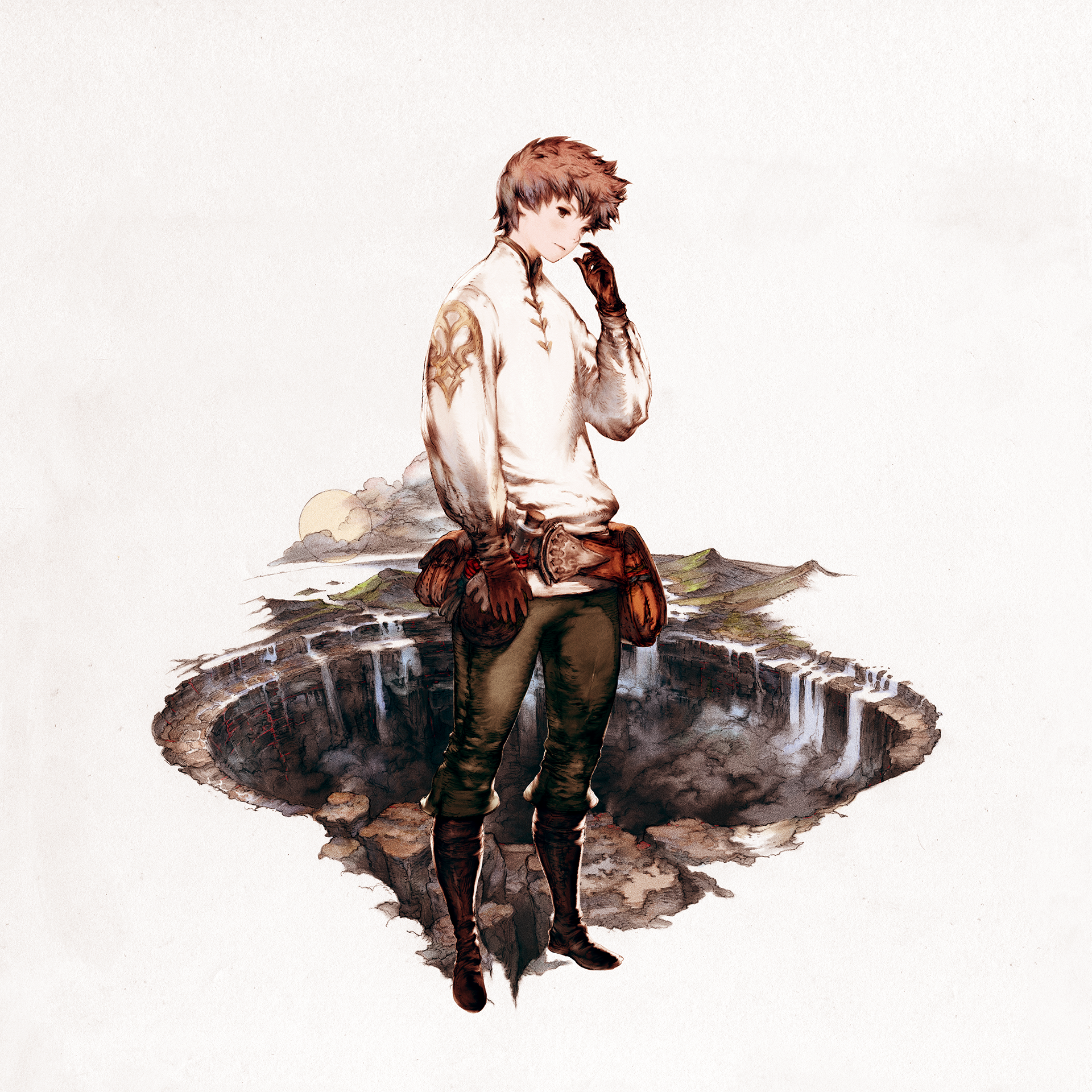 1boy belt belt_pouch black_pants boots bravely_default:_flying_fairy bravely_default_(series) brown_belt brown_boots brown_eyes brown_gloves brown_hair closed_mouth cloud full_body gloves highres knee_boots long_sleeves looking_down male_focus mountain official_art pants pouch protected_link psd_available second-party_source shirt short_hair solo standing tiz_arrior water waterfall white_background white_shirt yoshida_akihiko