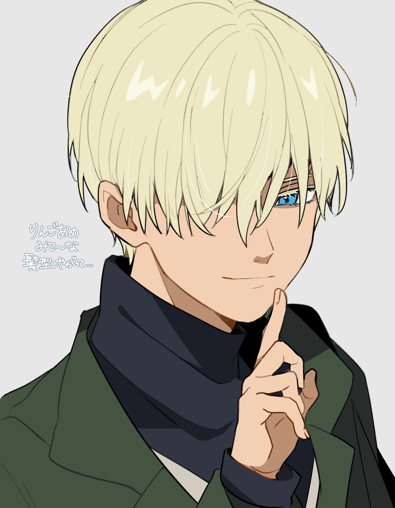1boy black_shirt blonde_hair blue_eyes char_aznable commentary_request fuji_(f_ukkami) green_jacket grey_background gundam gundam_gquuuuuux hair_over_one_eye highres index_finger_raised jacket long_sleeves looking_at_viewer male_focus shirouzu_(gundam) shirt short_hair simple_background smile solo translation_request turtleneck upper_body