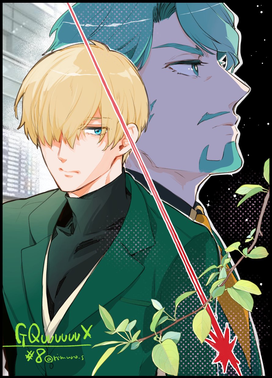 2boys artist_name beard black_shirt blonde_hair blue_eyes challia_bull char_aznable commentary_request copyright_name episode_number facial_hair green_eyes green_hair green_jacket gundam gundam_gquuuuuux hair_over_one_eye highres himuro_s jacket male_focus multiple_boys mustache shirouzu_(gundam) shirt short_hair turtleneck twitter_username