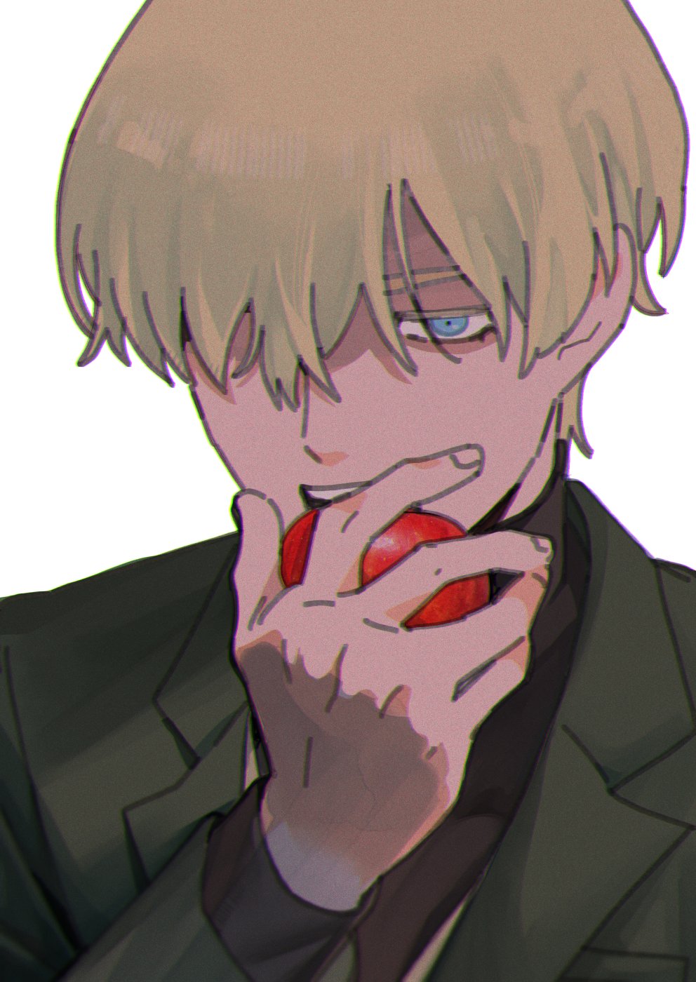 1boy apple black_shirt blonde_hair blue_eyes char_aznable commentary_request food fruit green_jacket gundam gundam_gquuuuuux hair_over_one_eye highres holding holding_food holding_fruit jacket long_sleeves male_focus mizu_mo_gura shirouzu_(gundam) shirt short_hair simple_background solo turtleneck upper_body white_background