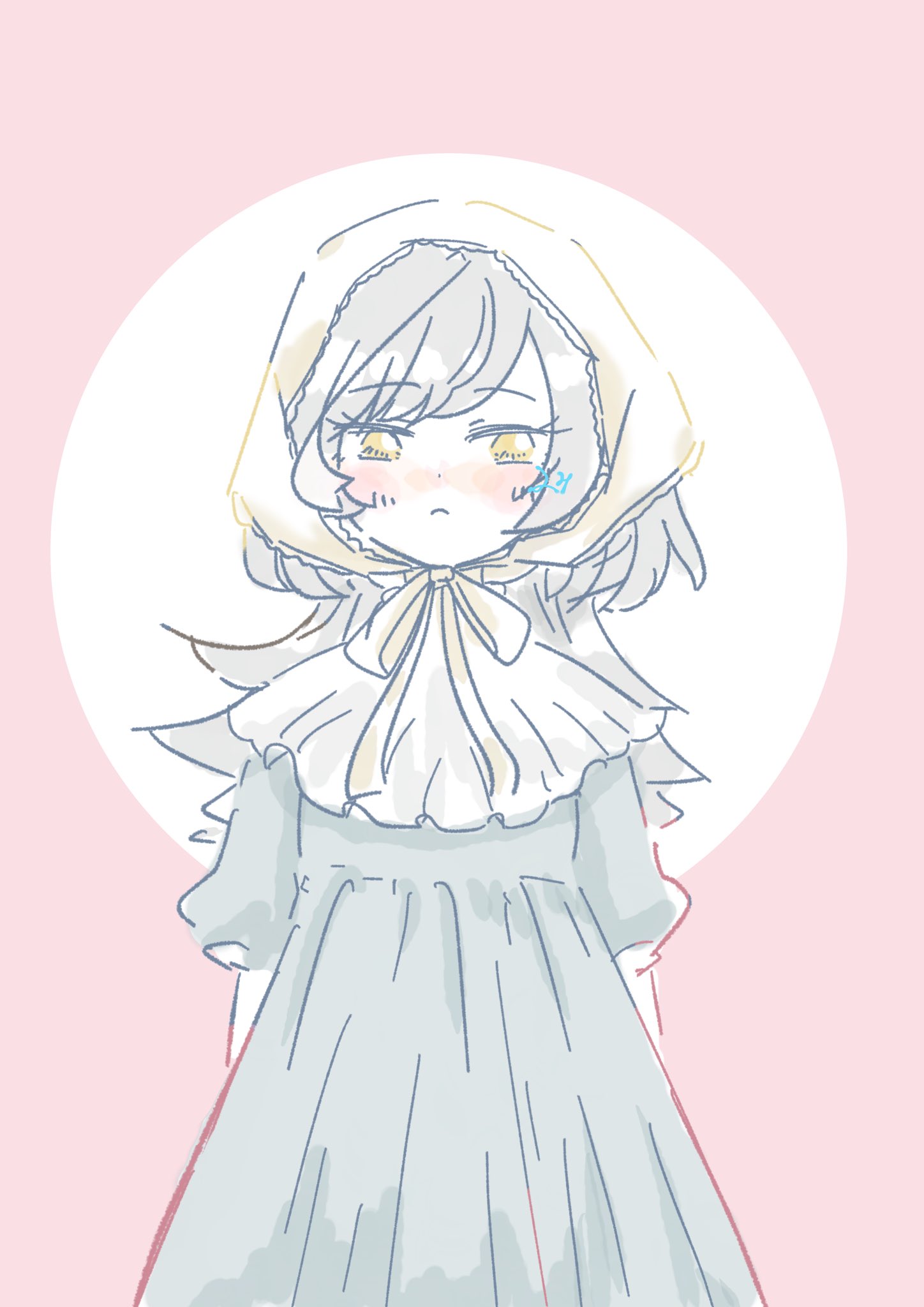 1girl arms_at_sides artist_name assault_lily blush circle closed_mouth commentary cowboy_shot dress frilled_shirt_collar frills fumi_(fumifumi3axl) grey_dress grey_hair headscarf highres long_hair looking_at_viewer neck_ribbon no_pupils pink_background ribbon sasaki_ran solo standing three-quarter_sleeves two-tone_background white_background white_headscarf white_ribbon yellow_eyes