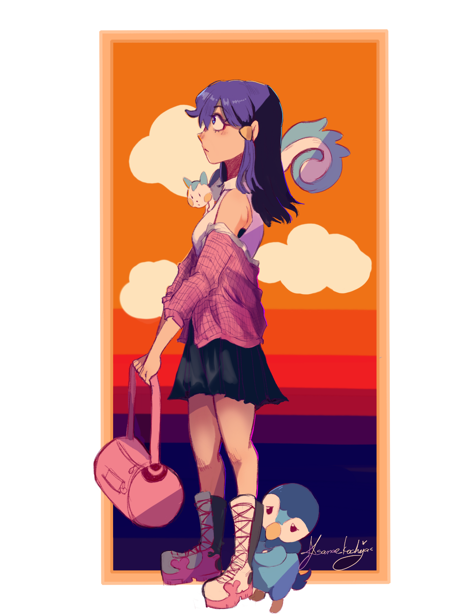 1girl bag black_skirt blue_hair dawn_(pokemon) duffel_bag from_side gen_4_pokemon hair_between_eyes highres looking_ahead nintendo off_shoulder on_shoulder pachirisu pink_shirt piplup pokemon pokemon_(creature) pokemon_diamond/pearl/platinum pokemon_on_shoulder sanae_kochiyas shirt skirt white_shirt
