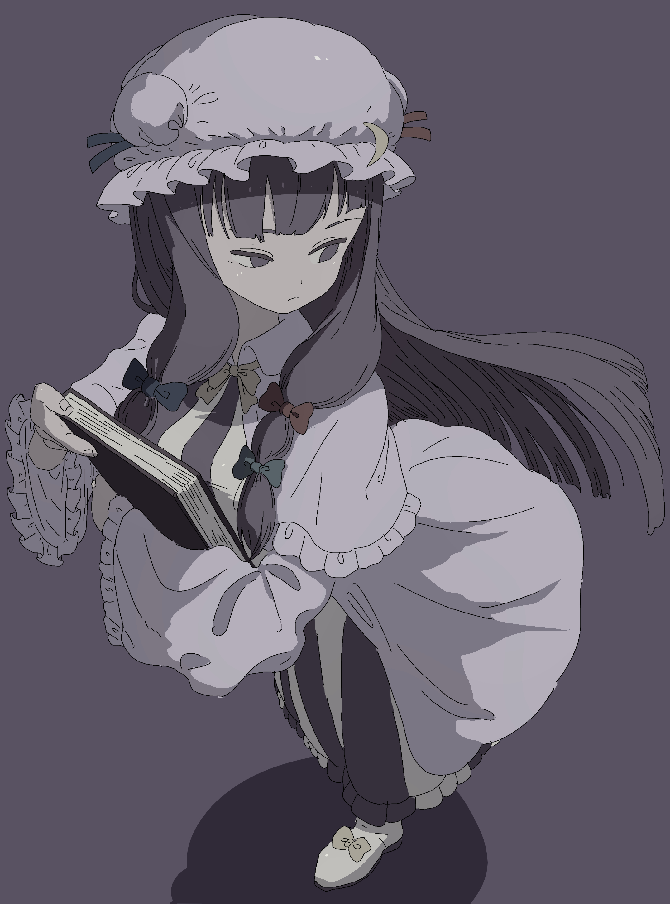 1girl absurdres book dress expressionless frills full_body hair_ribbon hat highres holding holding_book long_hair looking_to_the_side mob_cap patchouli_knowledge pink_robe purple_background purple_dress purple_eyes purple_hair ribbon robe shoes solo striped_clothes striped_dress touhou uzou_(uzooooooooo) white_dress white_shoes