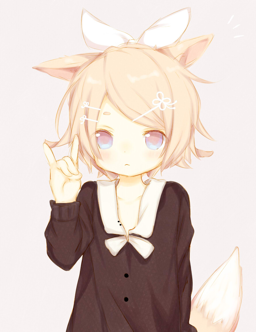 1girl animal_ears blonde_hair blue_eyes bow coco_(hinatacoco) collared_dress commentary_request dress fox_ears fox_girl fox_shadow_puppet fox_tail hair_bow hair_ornament hairclip kagamine_rin long_sleeves short_hair solo tail upper_body vocaloid