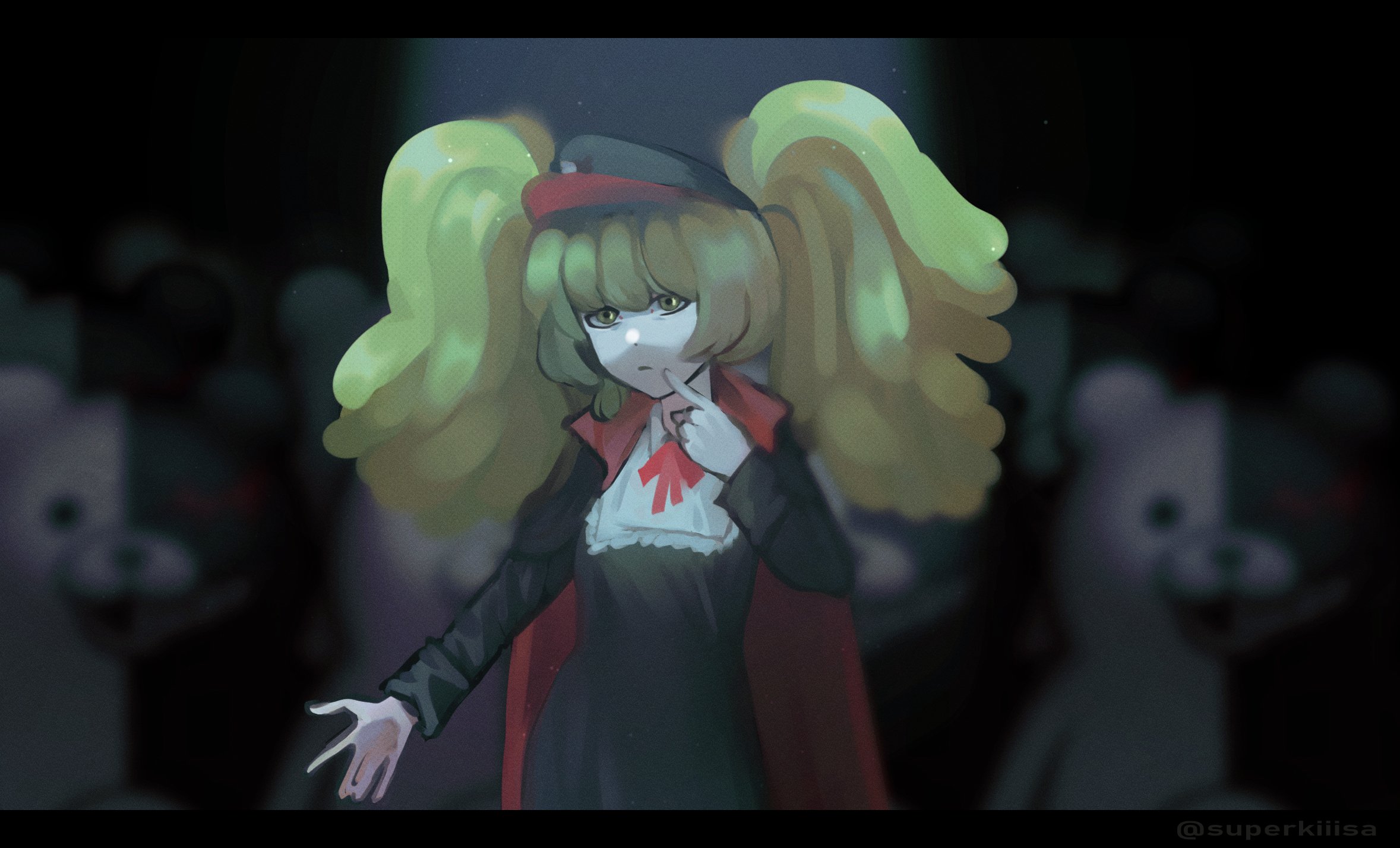 1girl black_dress black_hat blurry cape closed_mouth danganronpa_(series) danganronpa_3_(anime) dress green_eyes green_hair hand_on_own_face hat highres letterboxed light_particles lily_(superkiiisa) long_hair long_sleeves monokuma neck_ribbon official_alternate_hairstyle red_cape red_ribbon ribbon solo_focus towa_monaca twintails twitter_username upper_body