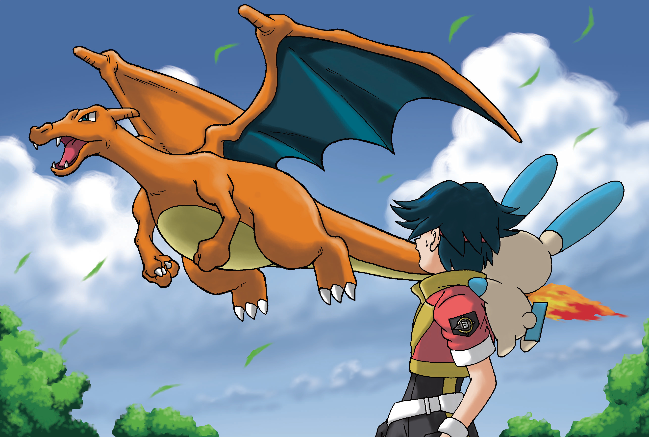 1boy blue_eyes blue_hair blue_sky charizard claws cloud day dragon dragon_wings fangs fire flame-tipped_tail flying gen_1_pokemon gen_3_pokemon highres jacket lunick_(pokemon) minun nintendo on_shoulder open_mouth outdoors pokemon pokemon_(creature) pokemon_on_shoulder pokemon_ranger_(series) pokemon_ranger_1 red_jacket short_hair short_sleeves sky sweatdrop tail v-shaped_eyes wings
