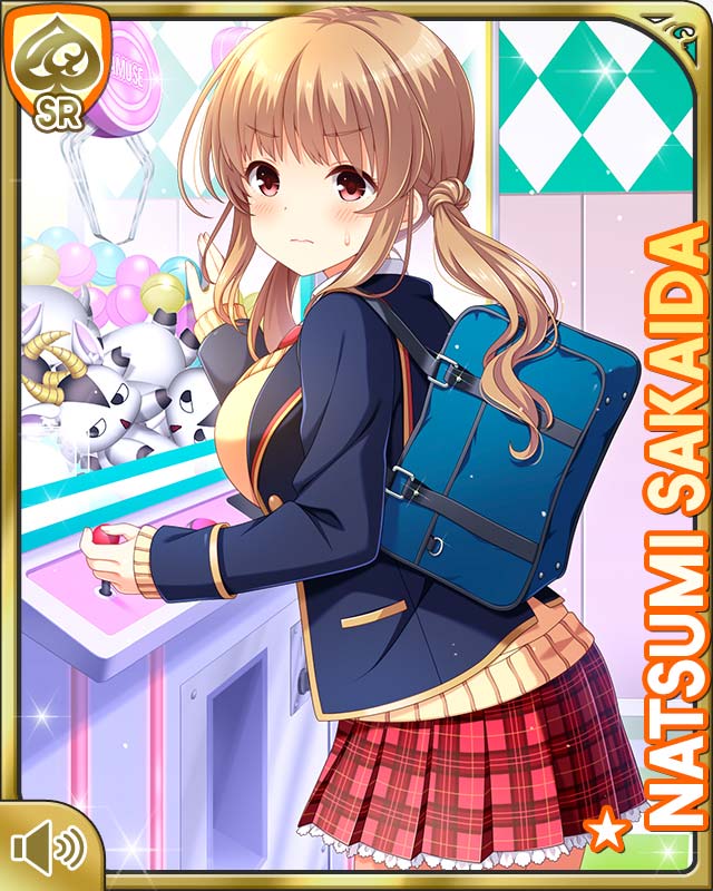 1girl arcade blazer blue_jacket breasts brown_hair card_(medium) closed_mouth crane_game day female_focus girlfriend_(kari) indoors jacket large_breasts leaning_forward long_hair official_art plaid_clothes plaid_skirt qp:flapper red_eyes red_skirt sakaida_natsumi school school_uniform shirt shoes skirt socks solo standing tagme white_shirt