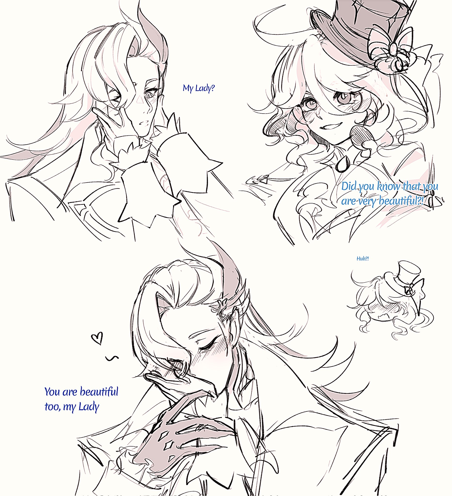 1boy 1girl blush bow collar couple english_text furina_(genshin_impact) genshin_impact gloves hair_between_eyes hand_on_another's_cheek hand_on_another's_face hat heart hetero highres kiss kissing_hand long_hair monochrome neuvillette_(genshin_impact) short_hair sketch vaffie_s wrist_cuffs