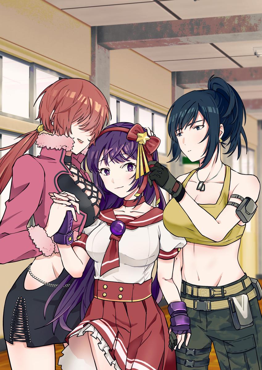 3girls asamiya_athena blue_hair highres ikari_warriors leona_heidern multiple_girls psycho_soldier purple_hair red_hair shermie_(kof) snk the_king_of_fighters