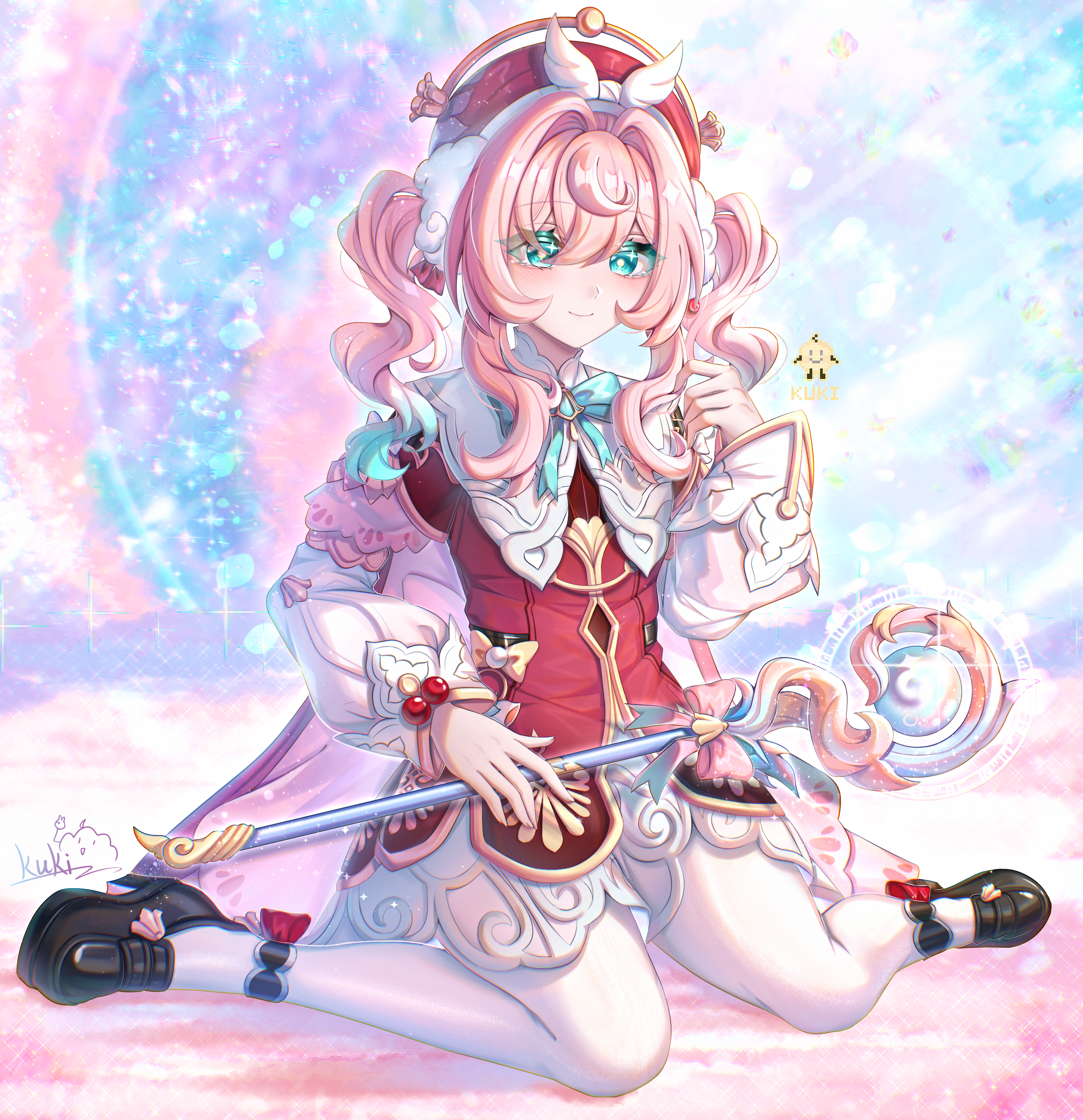 1girl absurdres aqua_eyes aqua_hair black_shoes breasts colorful_background commentary_request cutescookie dress hat highres holding holding_staff honkai:_star_rail honkai_(series) hyacine_(honkai:_star_rail) medium_hair multicolored_hair pantyhose red_dress red_hat shoes sitting small_breasts smile solo staff twintails two-tone_hair wariza white_pantyhose