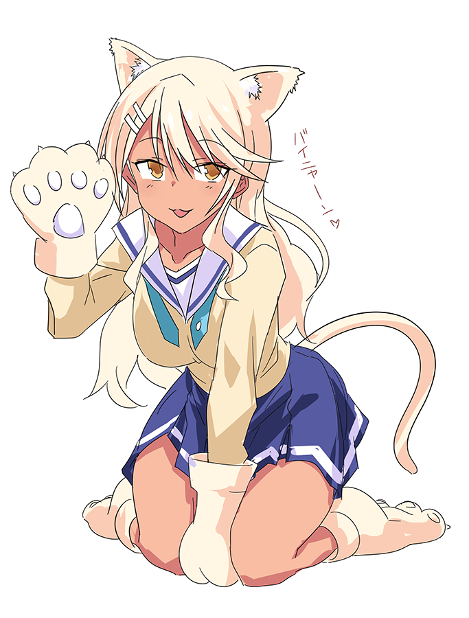 1girl :3 animal_ears animal_hands atsumare!_fushigi_kenkyuubu blonde_hair blue_skirt breasts cat_ears cat_girl cat_tail commentary_request dark-skinned_female dark_skin full_body gloves gyaru hair_ornament hairclip kawagishi_keitarou kemonomimi_mode kneeling large_breasts miniskirt orange_eyes paw_gloves paw_shoes sailor_collar school_uniform serafuku skirt solo tail tanaka_ryouko translation_request white_sailor_collar