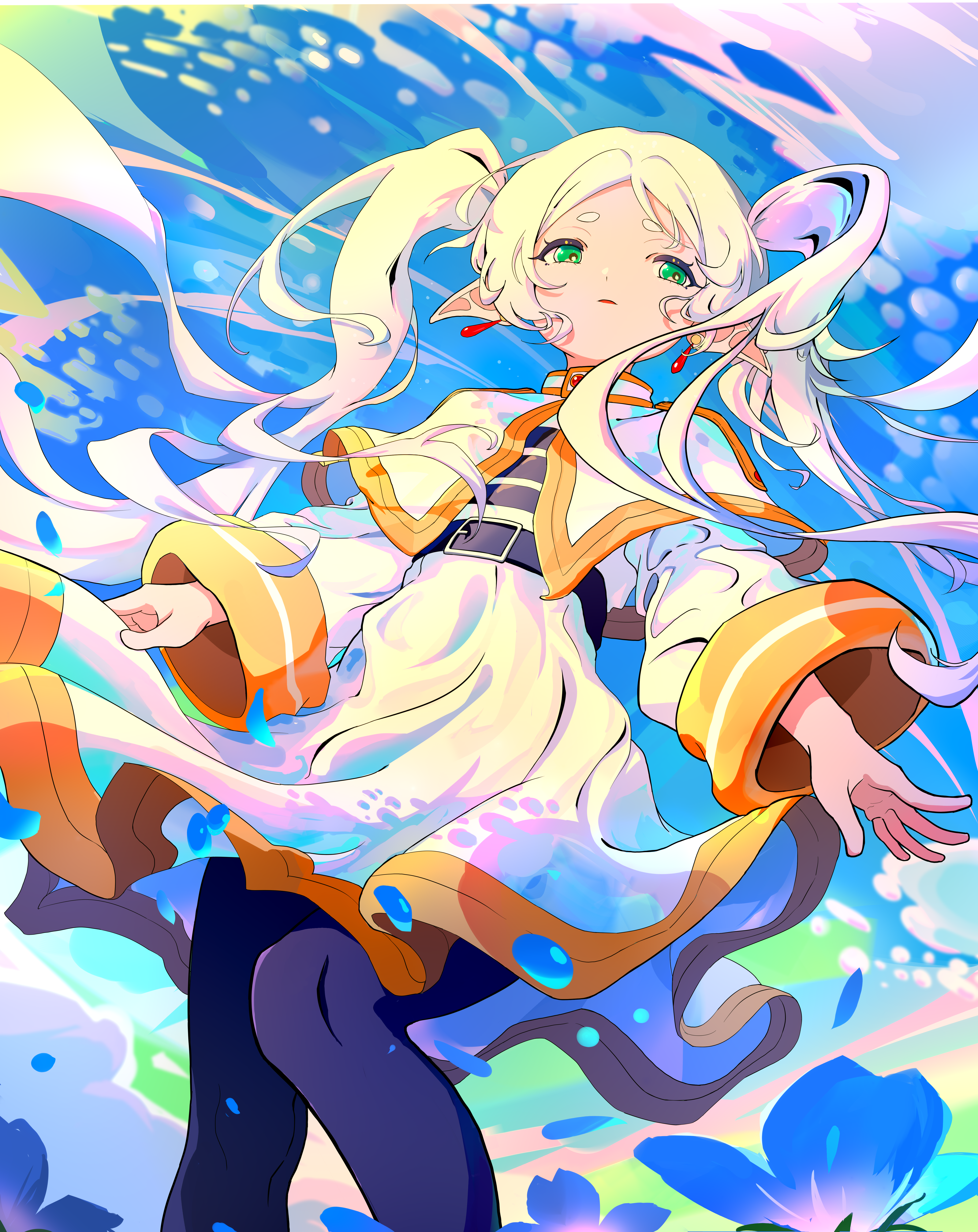 1girl absurdres belt black_belt black_pantyhose blue_sky capelet cloud cloudy_sky earrings elf frieren green_eyes highres jewelry kou_koufu long_hair outdoors pantyhose pointy_ears shirt skirt sky solo sousou_no_frieren striped_clothes striped_shirt twintails white_capelet white_hair white_skirt