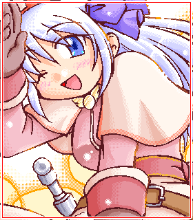 1girl 2000s_(style) :d acolyte_(ragnarok_online) bad_id belt blue_eyes blush bow brown_belt brown_shirt capelet commentary_request hair_bow long_hair long_sleeves looking_at_viewer lowres nagase_takeshi oekaki one_eye_closed open_mouth purple_bow ragnarok_online salute shirt smile solo upper_body white_capelet white_hair