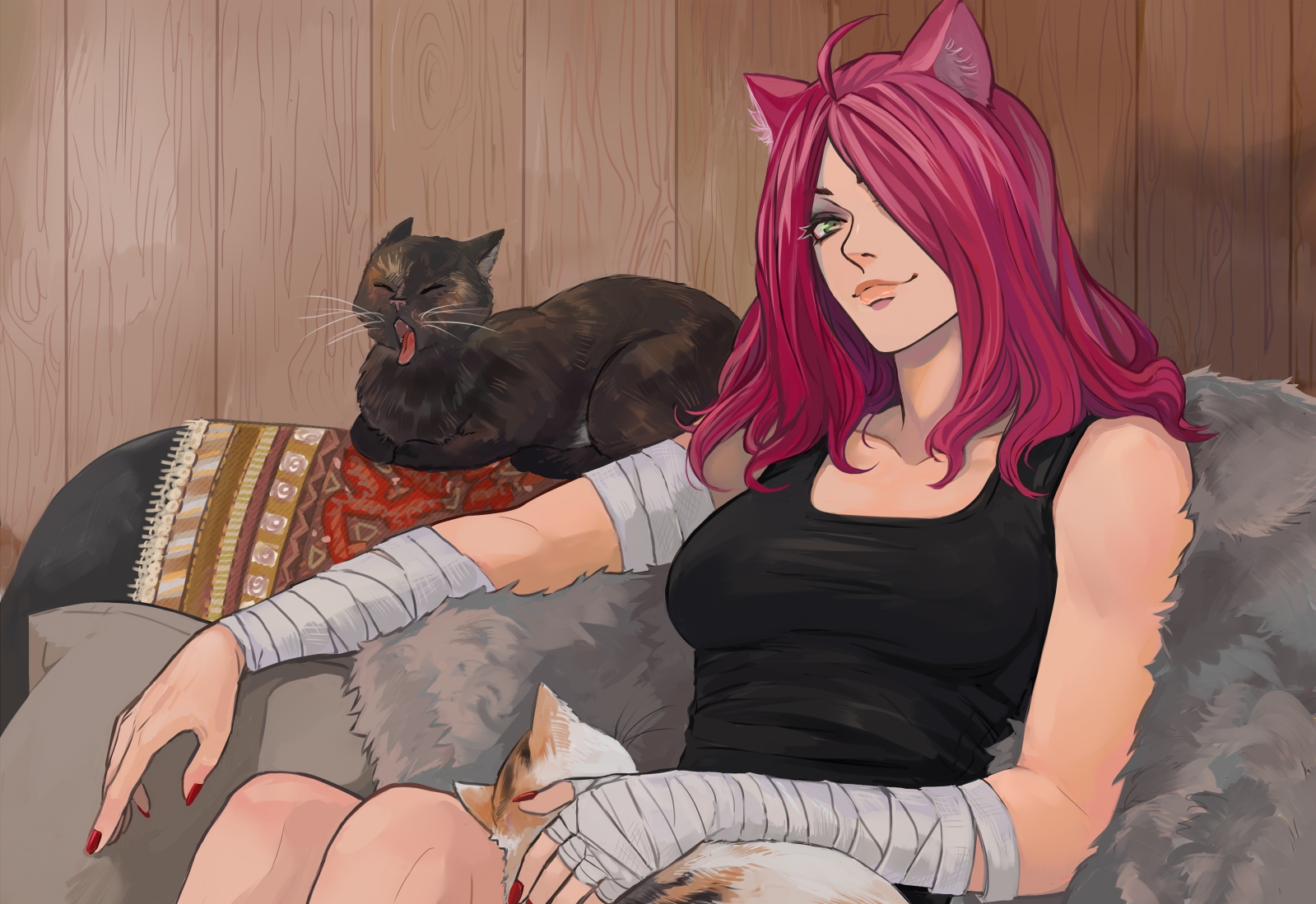 1girl bandaged_arm bandages black_tank_top breasts cat commentary_request couch eyebrows_hidden_by_hair green_eyes hair_over_one_eye medium_breasts medium_hair original pink_hair red_nails russian_commentary sitting smile solo tank_top vasiliy-plumber wooden_wall yawning