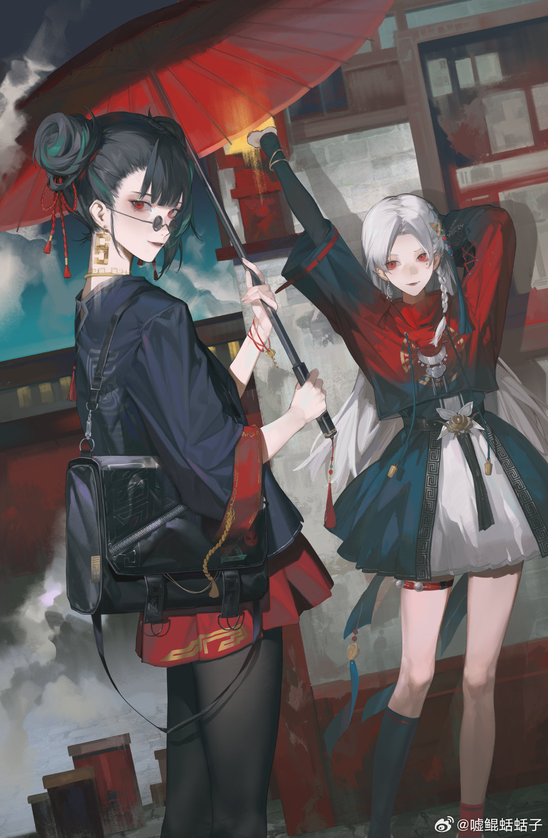 2girls architecture arm_behind_head arms_up bag black_bag black_hair black_pantyhose black_shirt blue_skirt braid changmingsuo_(guilongchao) chinese_commentary commentary_request double_bun earrings east_asian_architecture feet_out_of_frame guilongchao hair_bun hair_ribbon highres jewelry lin_(guilongchao) lipstick long_hair long_sleeves looking_at_viewer looking_back makeup multicolored_hair multiple_girls oil-paper_umbrella outdoors pantyhose pleated_skirt red_eyes red_ribbon red_skirt red_umbrella ribbon round_eyewear shirt short_hair shu_kunkuokuozi single_sidelock skirt smile standing streaked_hair stretching sunglasses umbrella watermark weibo_watermark white_hair