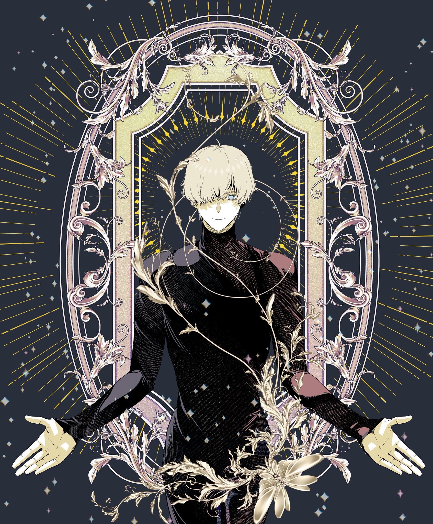 1boy black_shirt blonde_hair blue_eyes border char_aznable commentary_request cowboy_shot gundam gundam_gquuuuuux hair_over_one_eye highres long_sleeves looking_at_viewer male_focus nyan_co3 ornate_border picture_frame shirouzu_(gundam) shirt short_hair smile solo turtleneck