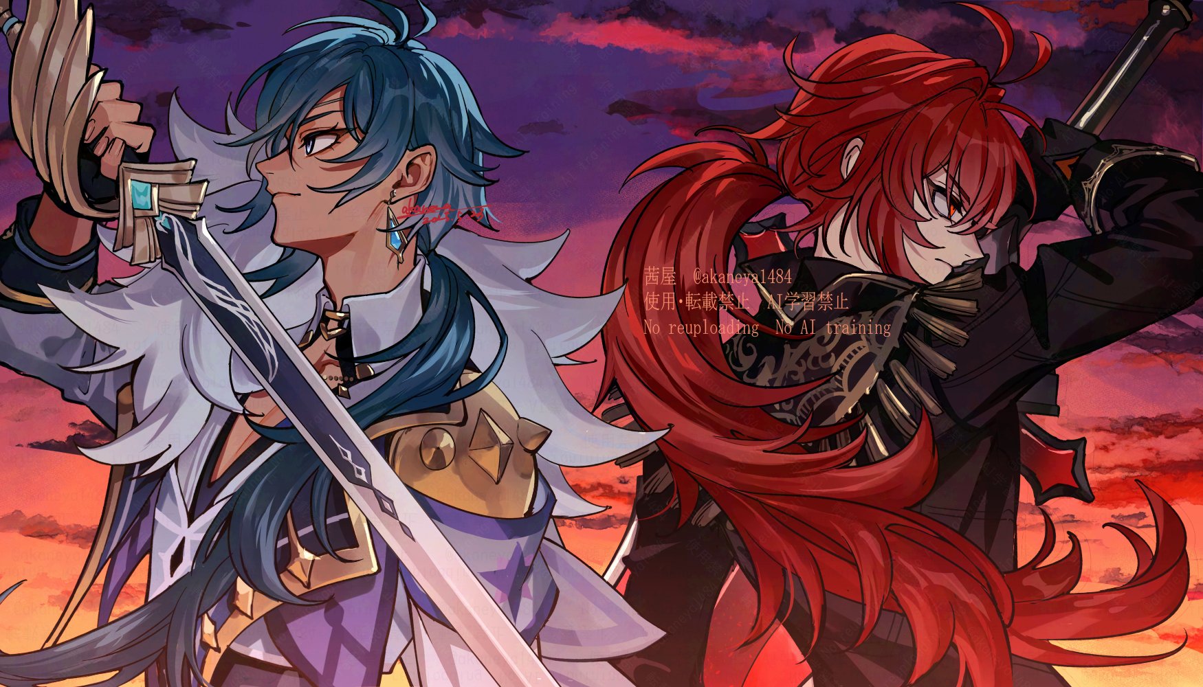 2boys akaneya_(akaneya1484) antenna_hair arm_up armband artist_name back-to-back black_coat black_gloves blue_armband blue_cape blue_eyes blue_hair blue_vest cape cleavage_cutout closed_mouth clothing_cutout cloud coat collared_shirt commentary_request crossed_bangs dark-skinned_male dark_skin dated diluc_(genshin_impact) earrings evening favonius_sword_(genshin_impact) fingerless_gloves floating_hair fur-trimmed_cape fur_trim genshin_impact gloves gold_trim gradient_sky hair_between_eyes hair_intakes hair_over_shoulder highres holding holding_sword holding_weapon jewelry kaeya_(genshin_impact) lapels long_hair long_sleeves looking_ahead low_ponytail male_focus multiple_boys outdoors pectoral_cleavage pectorals ponytail red_eyes red_hair serious shirt signature sky sleeve_cuffs spikes sword tassel twilight twitter_username upper_body v-shaped_eyebrows vest watermark weapon white_shirt wing_collar wolf's_gravestone_(genshin_impact)