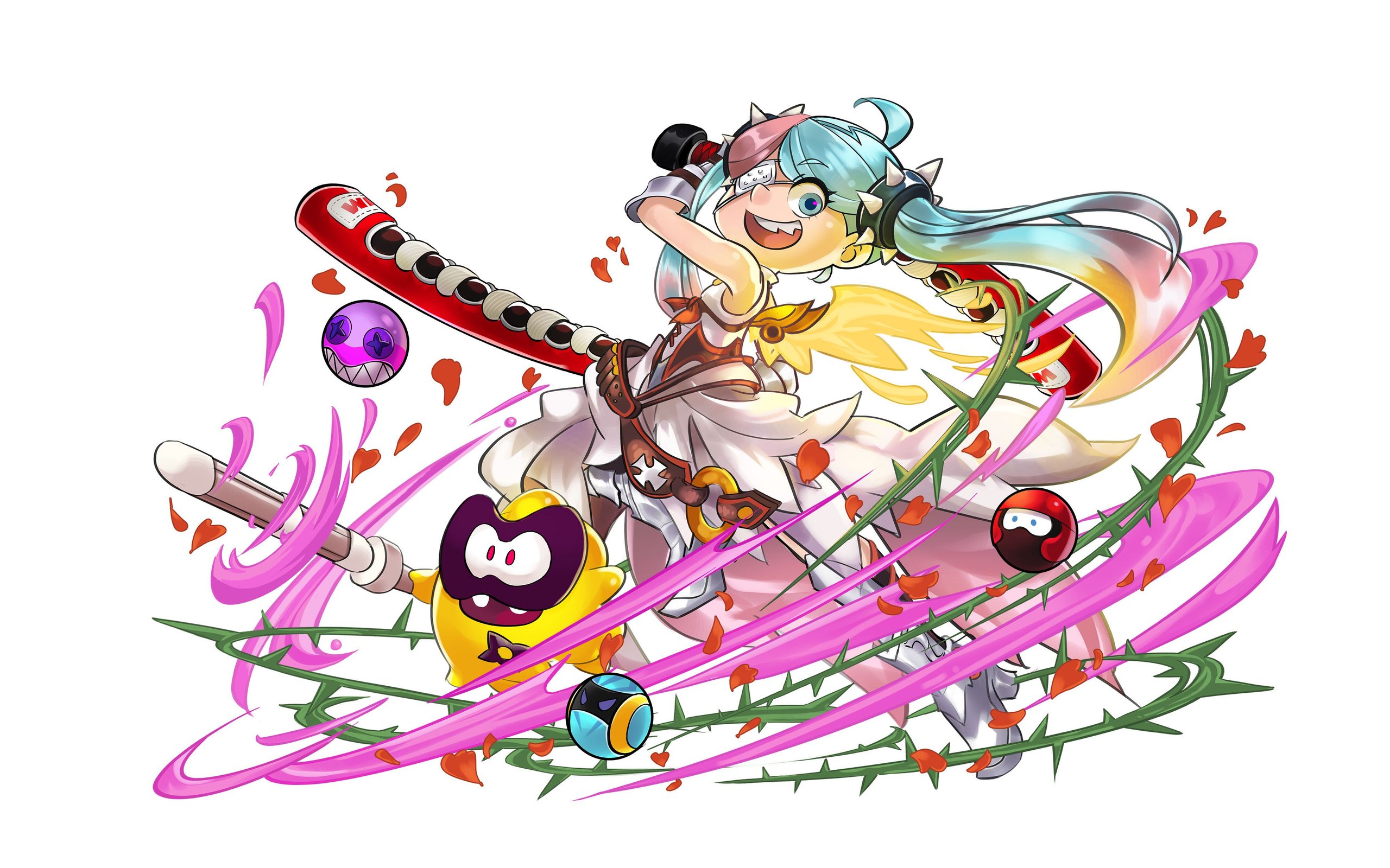 1girl ahoge aqua_eyes aqua_hair armored_boots armored_gloves artist_request belt black_outline boots brown_belt collared_dress commentary cross crossover dress drone dual_wielding empire_waist english_commentary english_text eyepatch fake_wings full_body game_cg gradient_hair green_outline gumchi high-low_dress highres holding holding_weapon ippon_katana iron_cross knee_boots leg_up long_dress long_hair lucy_(ninjala) medical_eyepatch multicolored_hair ninjala o-ring official_art open_mouth outline parted_bangs petals pink_hair plant purple_outline puzzle_&_dragons red_eyes red_outline red_petals red_ribbon ribbon second-party_source sharp_teeth shinai shuriken silver_armor spiked_hair_ornament sword tachi-e teeth tongue two-sided_dress two-sided_fabric two-tone_hair upper_teeth_only very_long_hair vines weapon white_background white_dress wings yellow_outline yellow_wings