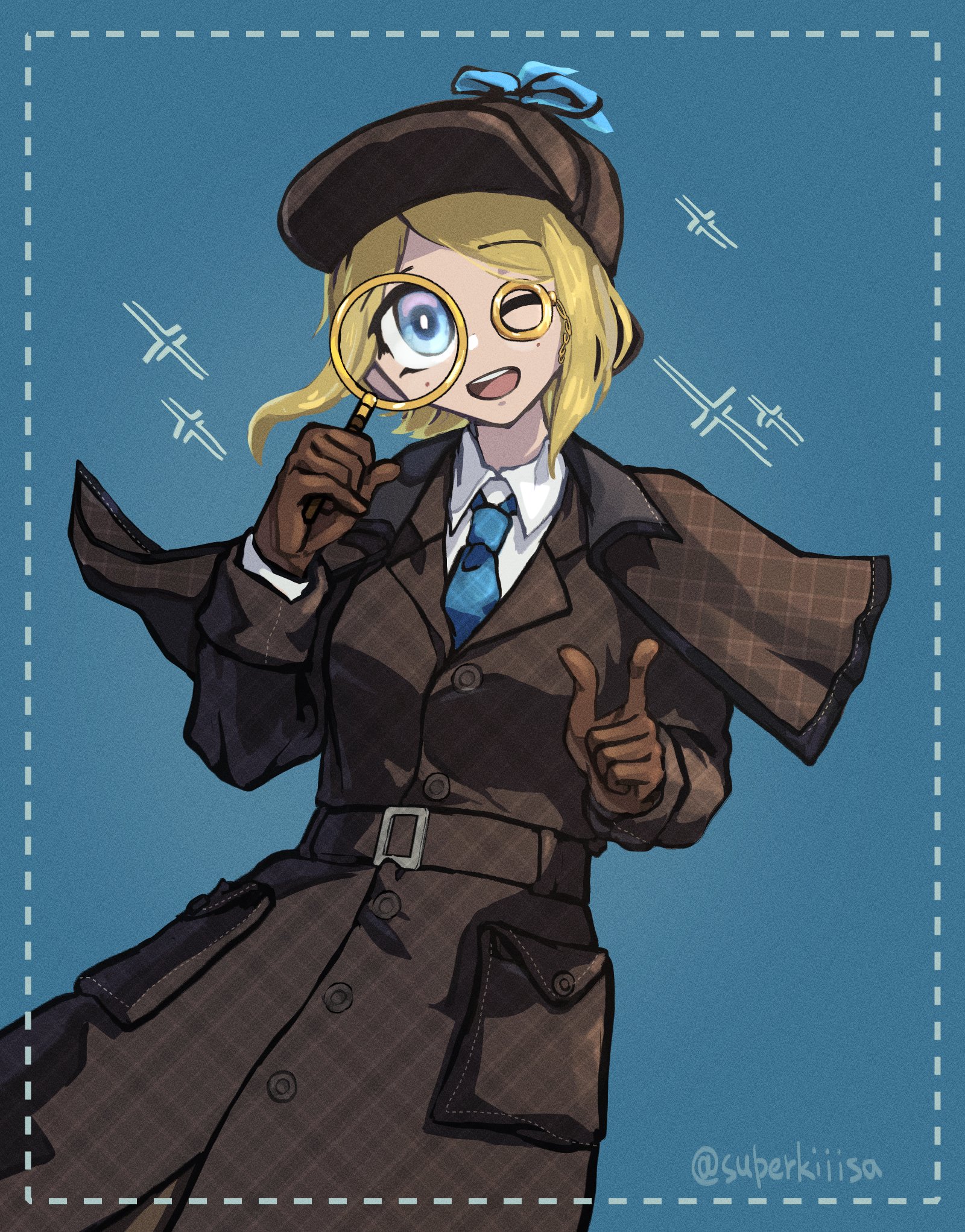 1girl ;d blonde_hair blue_background blue_eyes blue_necktie border brown_coat brown_gloves brown_hat coat collared_coat collared_shirt detective emma_woods emma_woods_(lady_truth) gloves hat highres holding holding_magnifying_glass identity_v lily_(superkiiisa) long_sleeves magnifying_glass monocle necktie one_eye_closed open_mouth shirt short_hair smile solo trench_coat twitter_username white_shirt