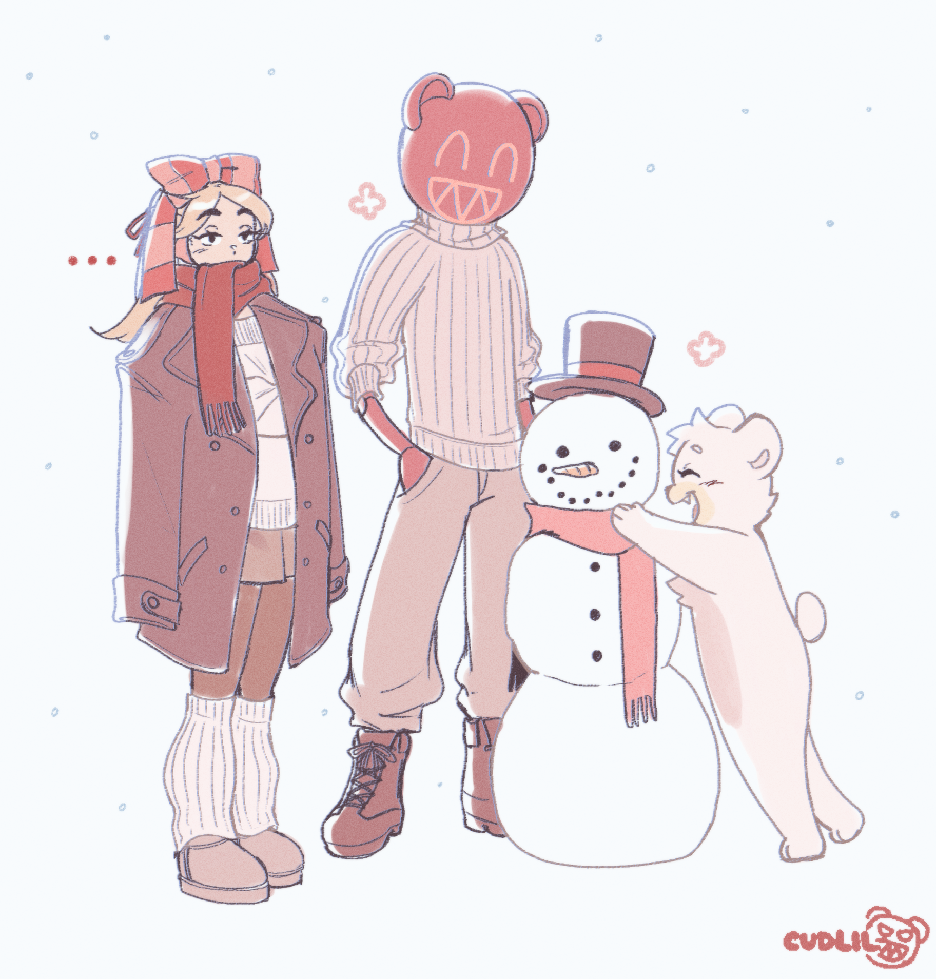 ... 1boy 2girls ^_^ animal_ears artist_name bear_bro_(cudlil) bear_ears bear_girl black_eyes black_hat blonde_hair boots brown_boots brown_jacket brown_pantyhose brown_skirt closed_eyes clothed_robot commentary cuddles_(cudlil) cudlil cudlil_(character) english_text fangs furry furry_female grey_boots grey_pants grey_sweater hair_ribbon hat highres humanoid_robot jacket long_hair looking_down multiple_girls off-shoulder_sweater off_shoulder original outdoors pants pantyhose parted_lips red_ribbon red_scarf ribbed_sweater ribbon robot scarf skirt sleeves_past_fingers sleeves_past_wrists smile snowing speech_bubble sweater untranslatable_commentary top_hat waving white_sweater