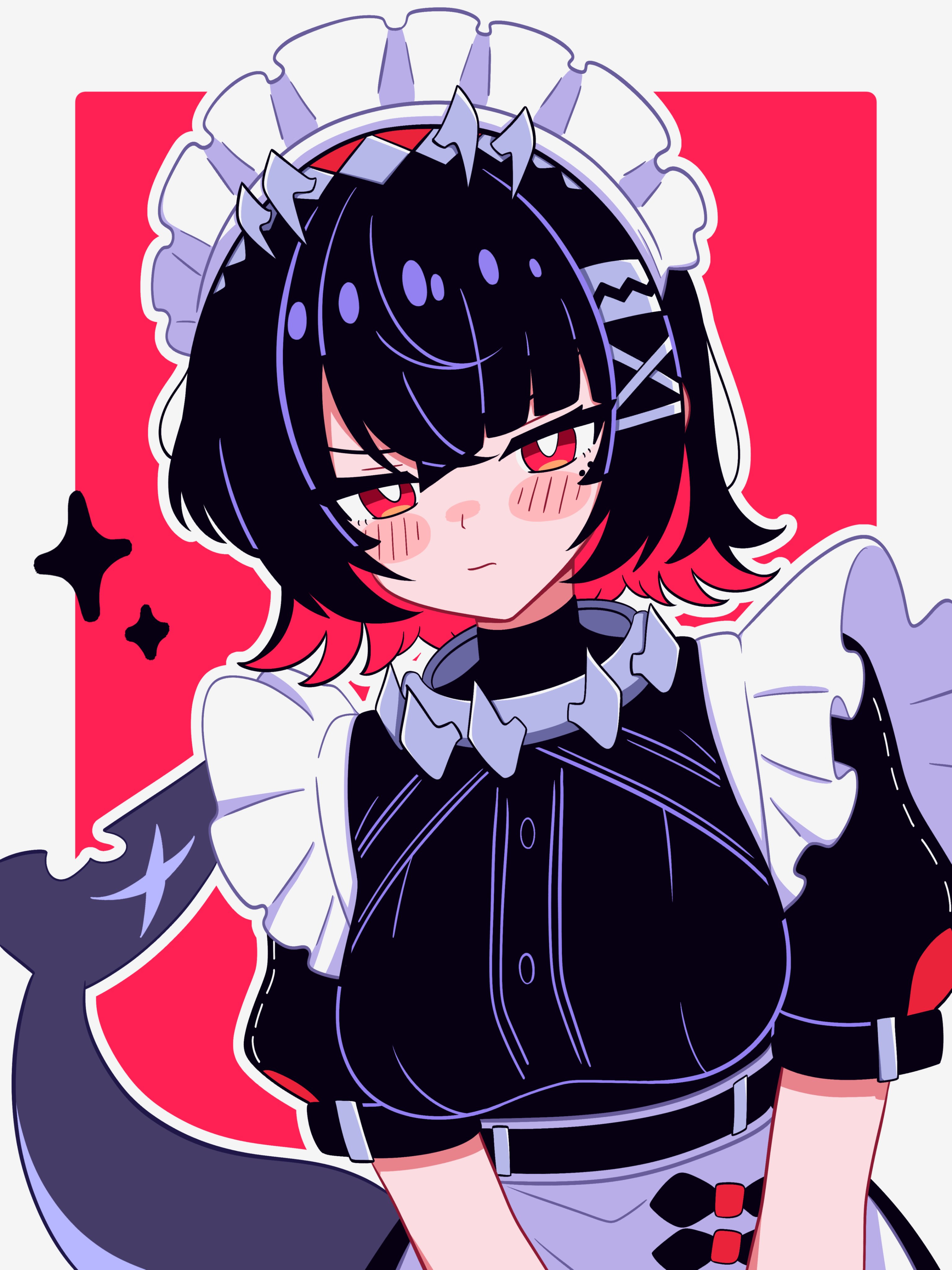 1girl absurdres black_hair breasts colored_inner_hair ellen_joe fins fish_tail hair_between_eyes hairband highres large_breasts loblob_art looking_at_viewer magikflaan maid maid_headdress metal_hairband multicolored_hair red_eyes shark_girl shark_tail short_hair tail upper_body zenless_zone_zero