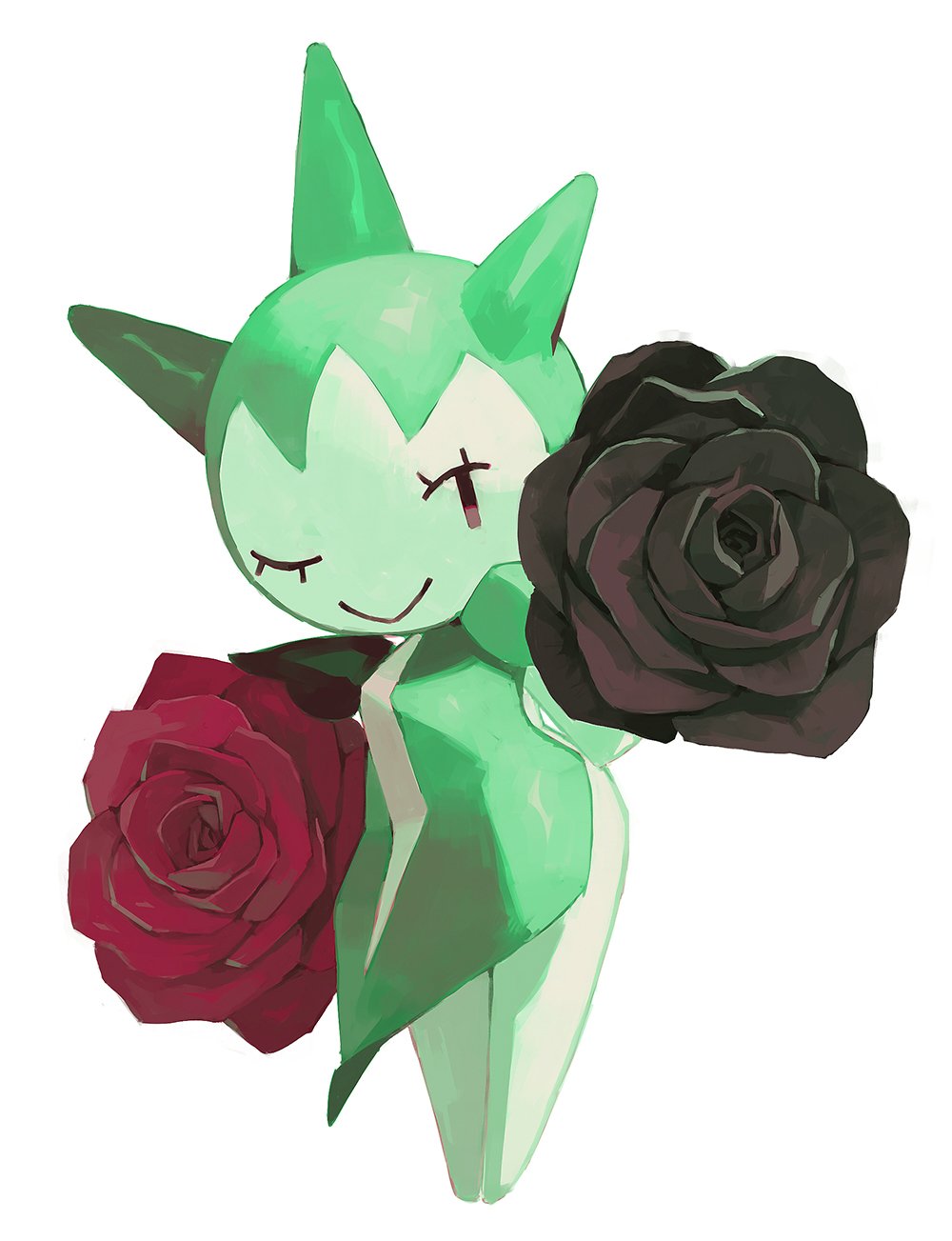 1girl black_eyes black_flower bluekomadori closed_mouth eyelashes flower full_body gen_3_pokemon highres nintendo pokemon pokemon_(creature) red_flower roselia_(pokemon) simple_background smile solo white_background