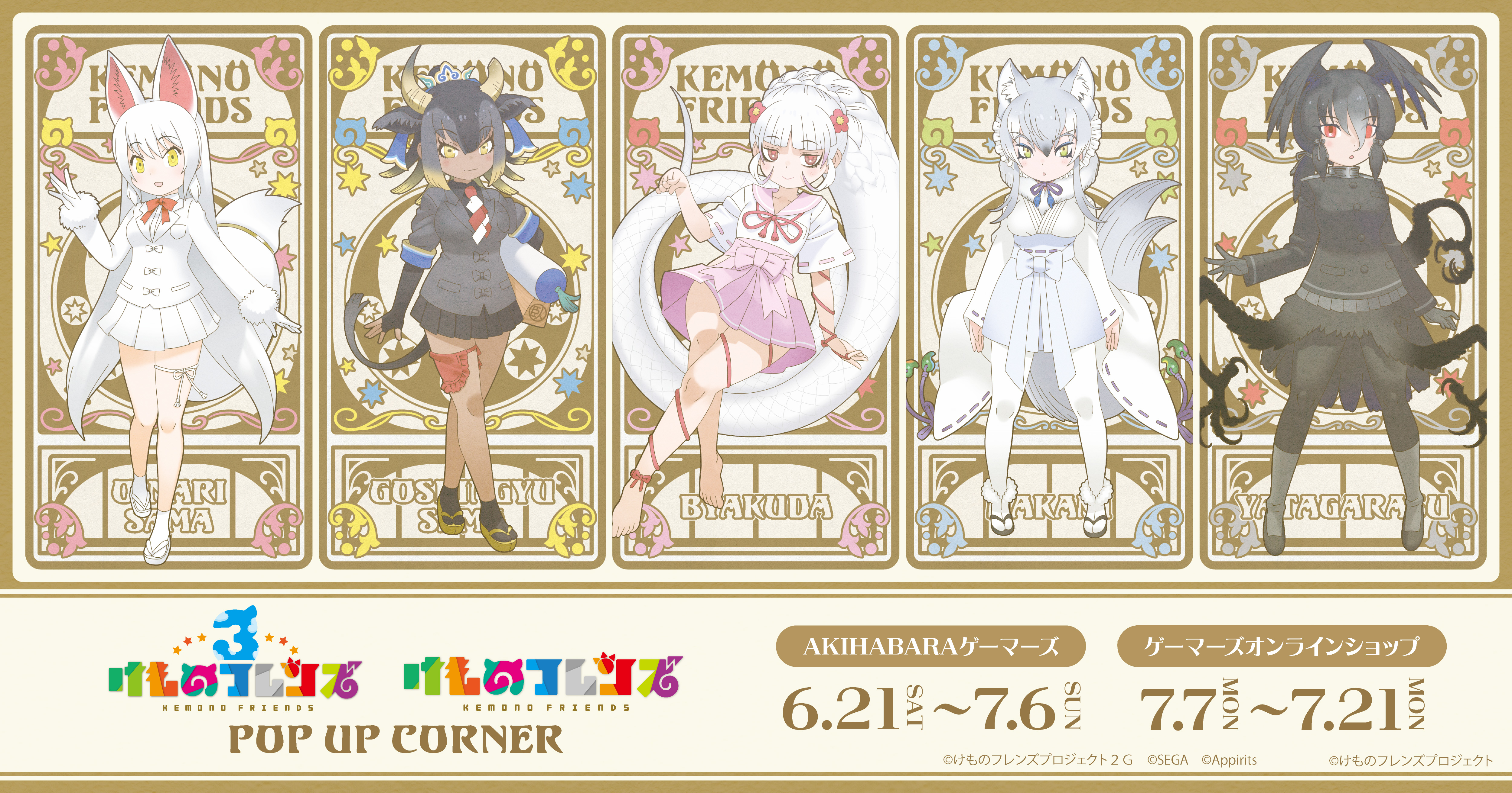 5girls absurdres animal_ears art_nouveau barefoot bird_girl bird_tail bird_wings black_hair boots bow bowtie byakuda_(kemono_friends) copyright_name cow_ears cow_girl cow_horns cow_tail elbow_gloves extra_ears feathered_wings fingerless_gloves fox_ears fox_girl fox_tail full_body gloves goshingyu-sama_(kemono_friends) grey_hair hair_ornament head_wings highres horns jacket japanese_clothes japari_symbol kemono_friends kemono_friends_3 kimono long_hair looking_at_viewer makami_(kemono_friends) multiple_girls necktie official_art oinari-sama_(kemono_friends) pantyhose pillow red_eyes sandals school_uniform serafuku shirt skirt snake_girl tabi tail white_hair wings wolf_ears wolf_girl wolf_tail yatagarasu_(kemono_friends) yellow_eyes yoshizaki_mine_(style) zouri