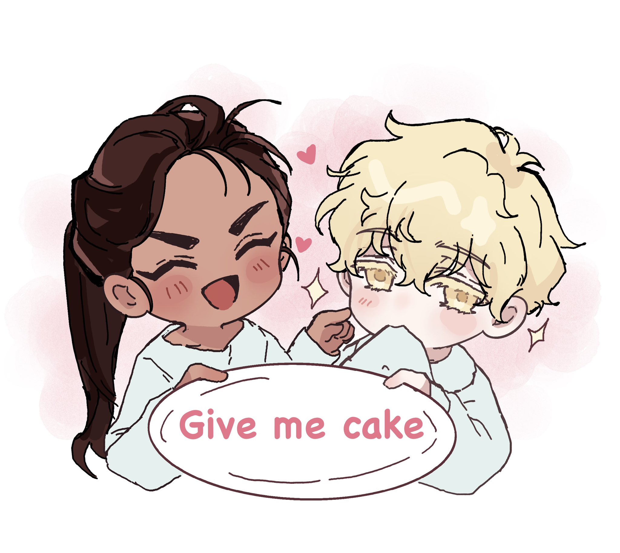 1boy 1girl aged_down alien_stage blonde_hair brown_hair chibi chibi_only clothes_in_mouth colored_eyelashes commentary dark-skinned_female dark_skin english_commentary english_text gift_art heart highres holding holding_plate hyuna_(alien_stage) lolo_(myon_creative) long_hair luka_(alien_stage) open_mouth plate ponytail shirt short_hair smile white_shirt yellow_eyes
