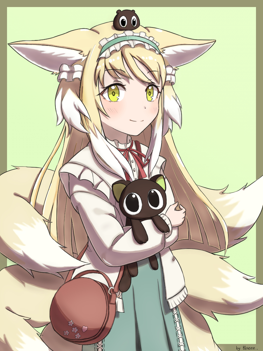 1girl animal_ears aqua_hairband aqua_skirt arknights bag blonde_hair blush buttons cardigan chinese_commentary closed_mouth commentary_request cowboy_shot creature creature_on_head crossed_arms crossover frilled_hairband frills green_eyes hairband heixiu highres holding holding_creature long_hair long_sleeves luo_xiaohei luo_xiaohei_(cat) luo_xiaohei_zhanji multicolored_hair multiple_tails neck_ribbon official_alternate_costume red_ribbon ribbon skirt smile solo split_mouth standing streaked_hair suzuran_(arknights) suzuran_(spring_praise)_(arknights) tail white_cardigan white_hair white_tail yanyan_blazee yellow_tail