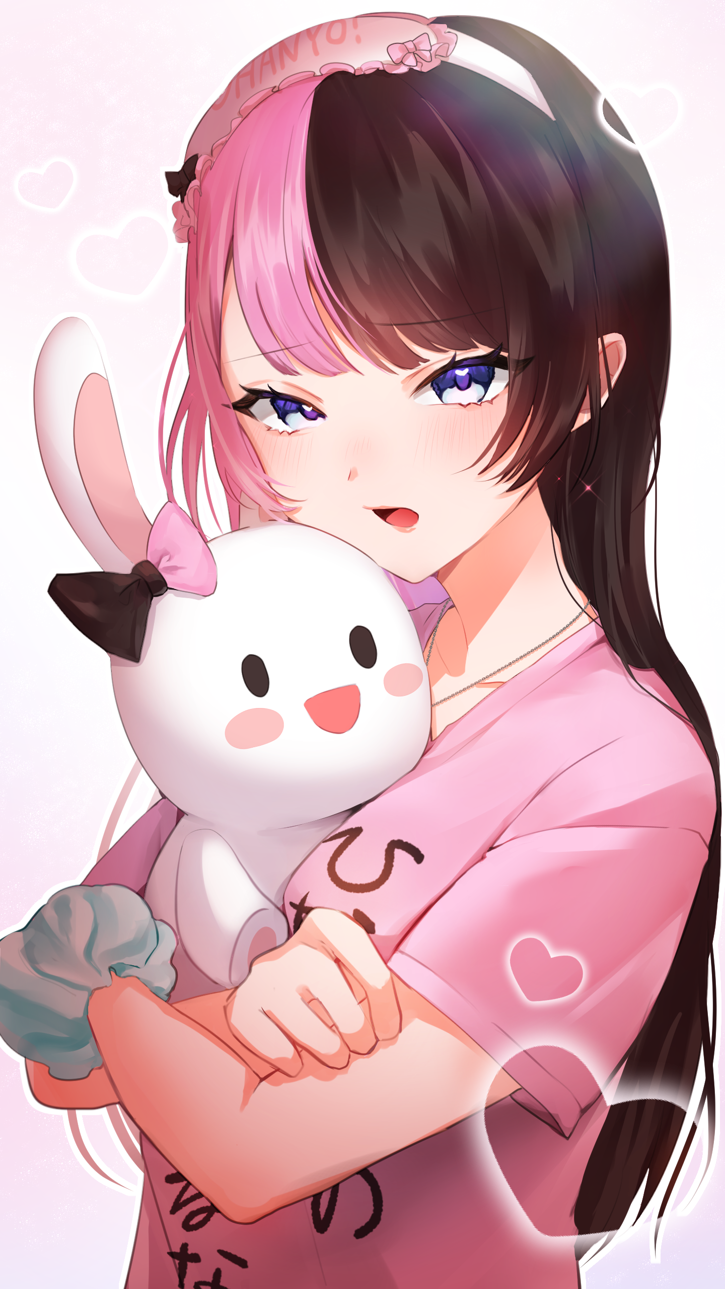 1girl absurdres blue_eyes brown_hair highres holding holding_stuffed_toy jewelry long_hair looking_at_viewer multicolored_hair necklace open_mouth pink_hair pink_shirt scrunchie shirt short_sleeves simple_background sleep_mask solo split-color_hair stuffed_toy t-shirt tachibana_hinano tachibana_hinano_(5th_costume) two-tone_hair upper_body virtual_youtuber vspo! white_background wrist_scrunchie yaya_(88cha)
