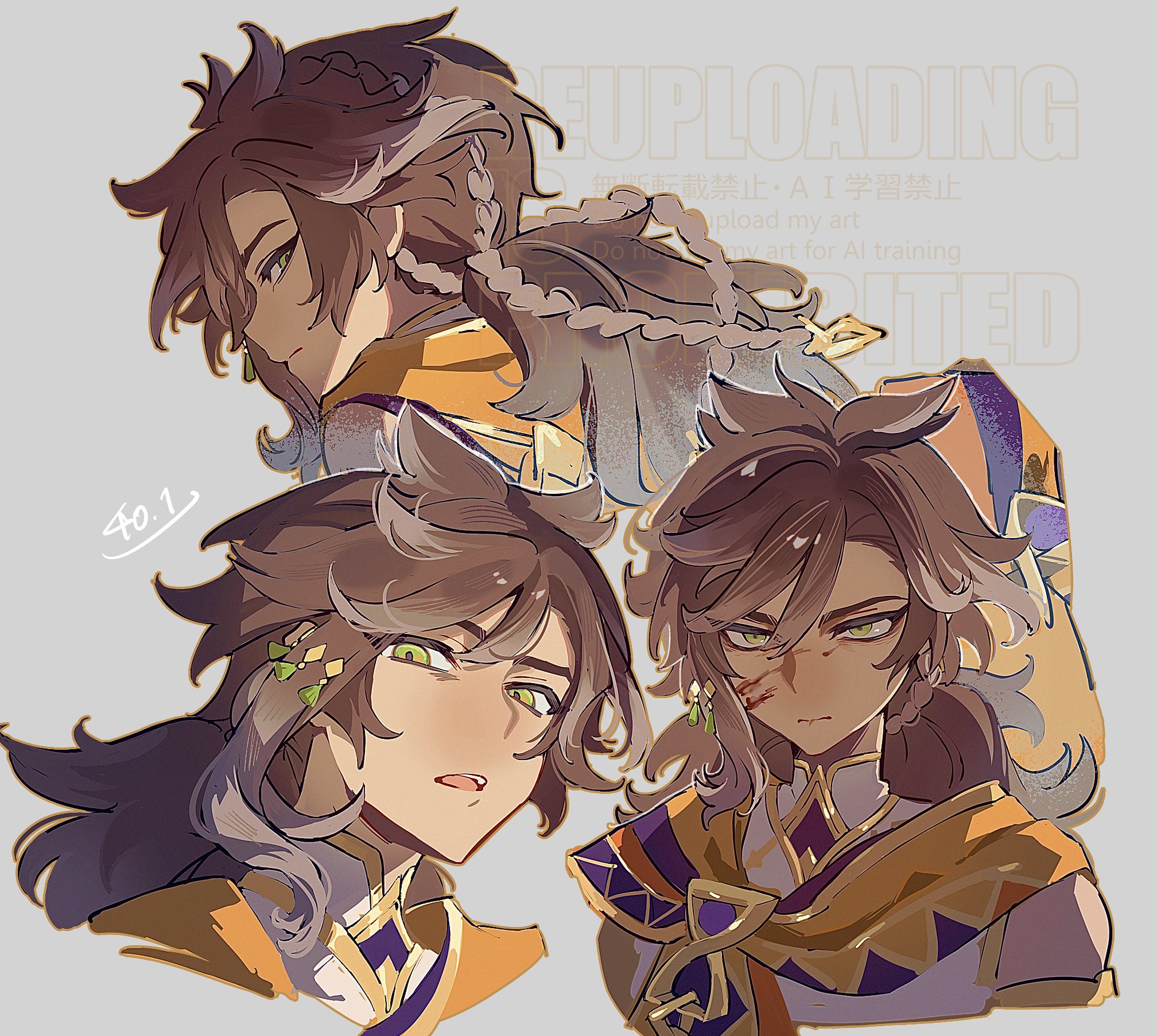 1boy artist_name blood blood_on_face braid brown_hair cape closed_mouth commentary_request cropped_shoulders dark-skinned_male dark_skin from_below genshin_impact gold_trim green_eyes grey_background hair_between_eyes hair_ornament highres long_hair looking_at_viewer looking_back male_focus multicolored_hair multiple_views open_mouth orange_cape parted_bangs serious sethos_(genshin_impact) shirt signature simple_background sky_yoichi sleeveless sleeveless_shirt streaked_hair teeth upper_body upper_teeth_only watermark white_shirt