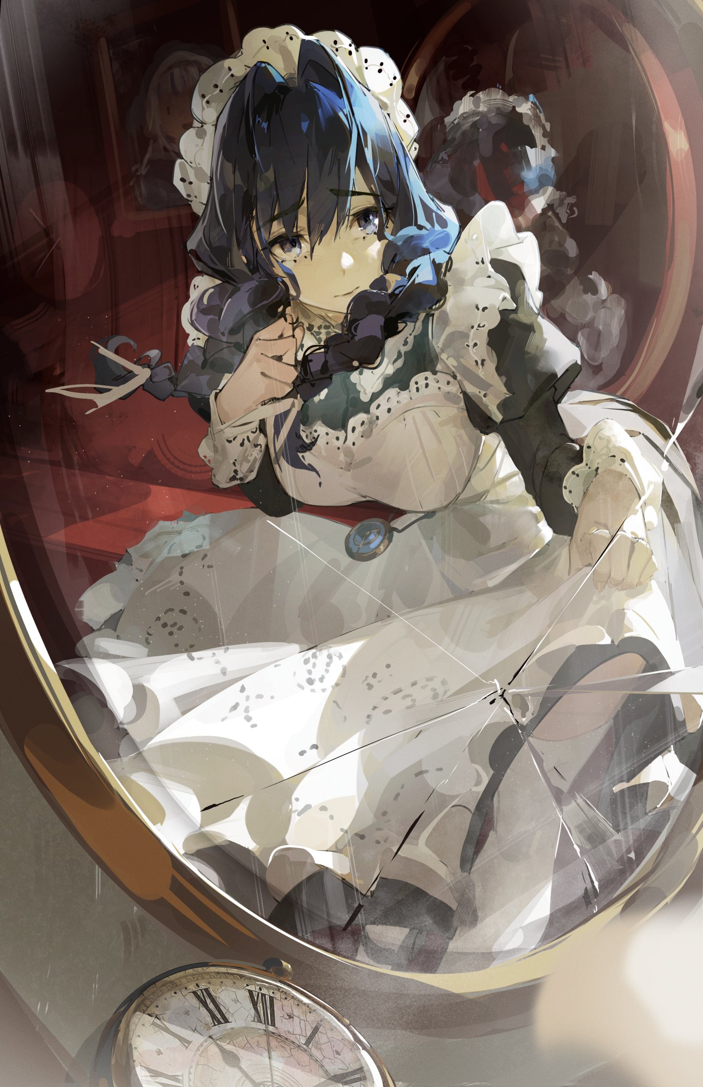 1girl apron black_dress blue_eyes blue_hair braid broken_mirror clock dress hair_intakes hair_ribbon hat highres hololive hololive_english kuno_(runkunochan) long_hair low_twin_braids mirror mob_cap official_alternate_costume official_alternate_hairstyle ouro_kronii ouro_kronii_(maid) pocket_watch reflection reflection_focus ribbon solo twin_braids virtual_youtuber watch white_apron white_ribbon