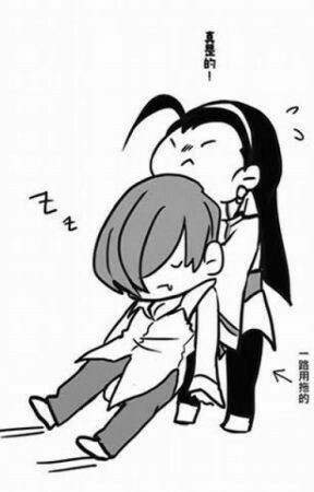 1boy 1girl black_hair carrying carrying_person chibi kagura_chizuru priestess red_hair snk the_king_of_fighters unconscious unconscious_male yagami_iori