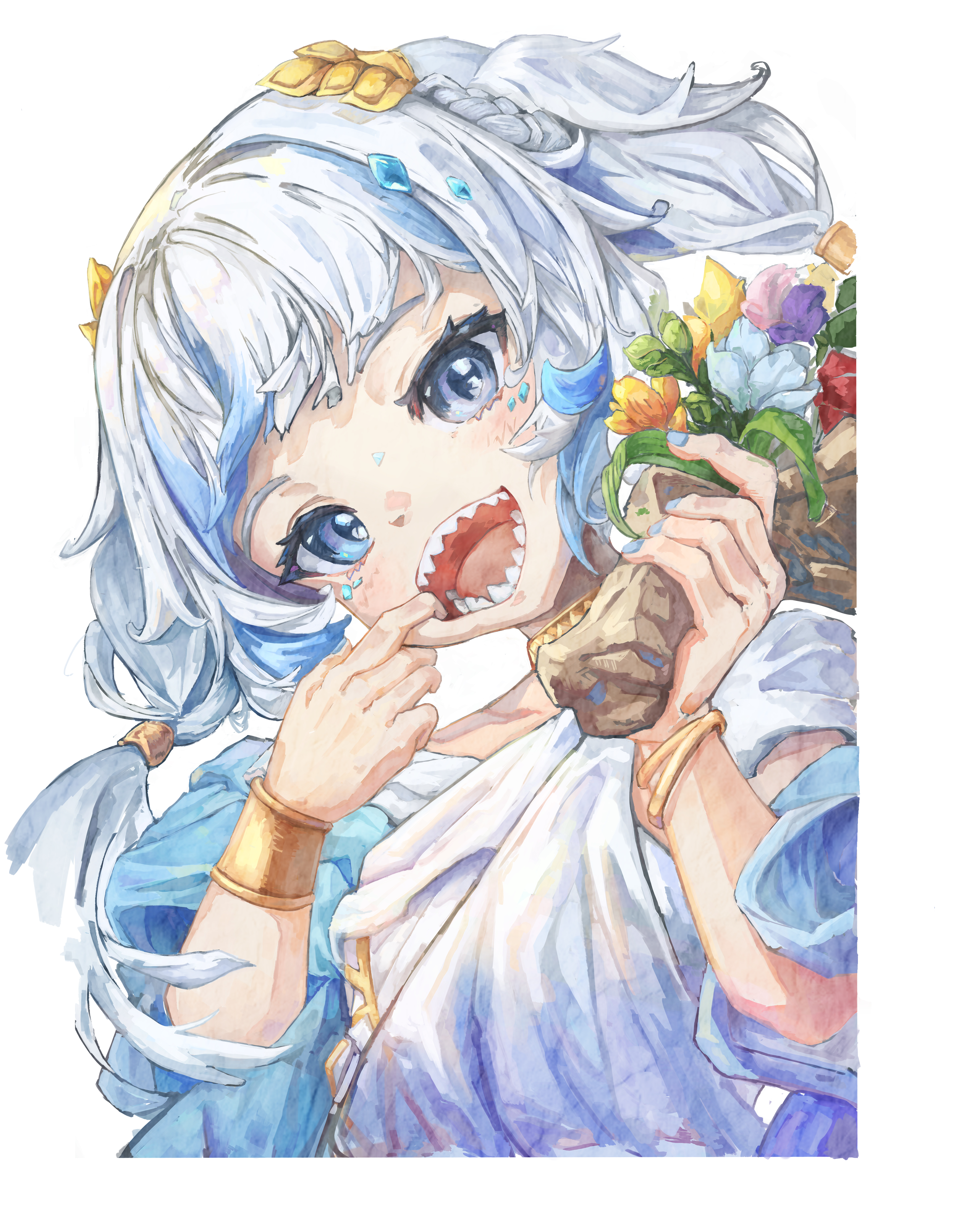 1girl absurdres ancient_greek_clothes bangle blue_dress blue_eyes blue_nails blue_streaks bouquet bracelet bracer braid chinese_commentary commentary_request dress finger_in_own_mouth flower gawr_gura gawr_gura_(party_dress) gold_choker gradient_clothes greco-roman_clothes highres holding holding_bouquet hololive hololive_english jewel_under_eye jewelry looking_at_viewer maskcat mouth_pull multicolored_hair sharp_teeth solo streaked_hair teeth twintails upper_body virtual_youtuber white_dress white_hair