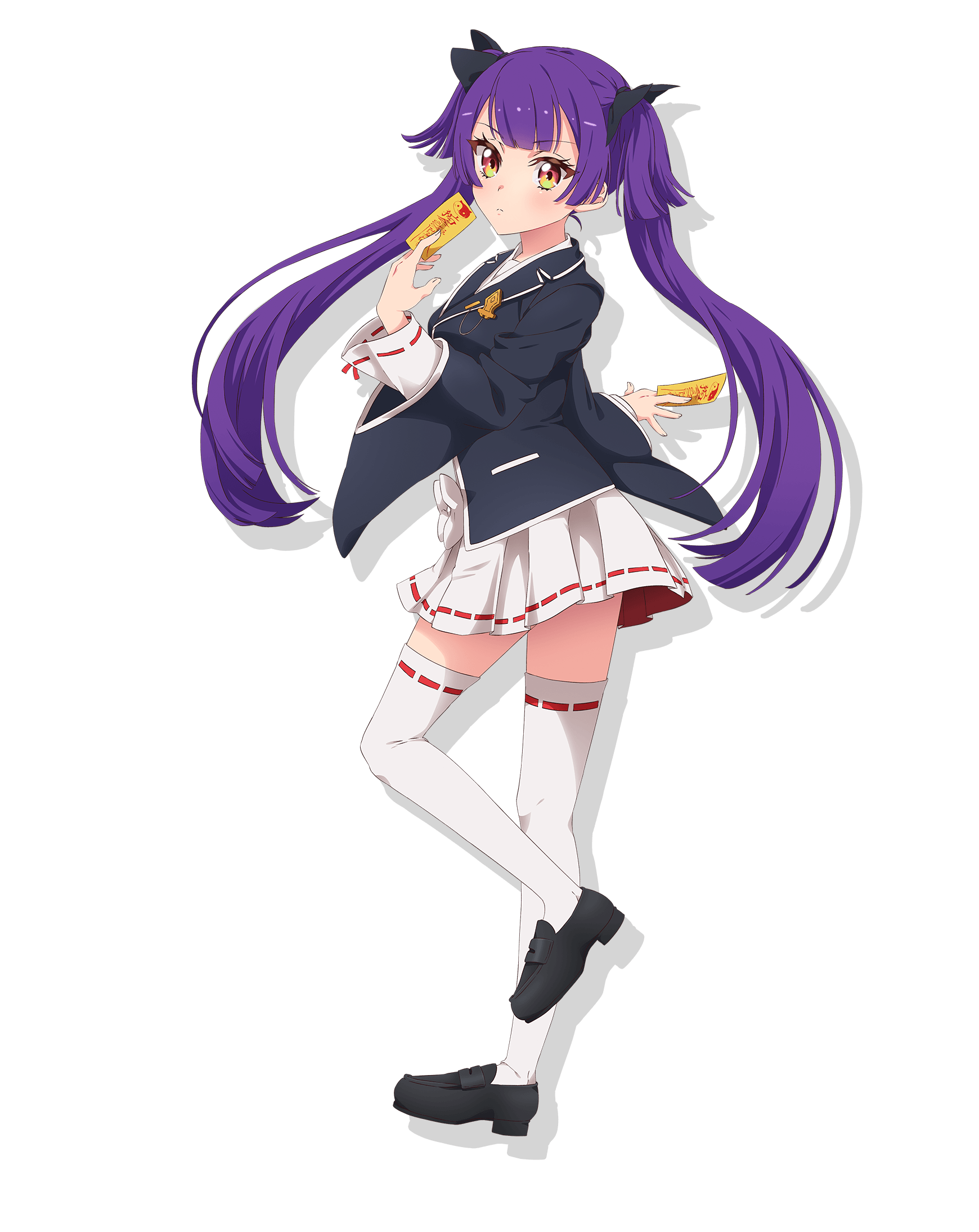 1girl full_body highres holding long_hair looking_at_viewer nekoashi_tsubomi official_art pleated_skirt purple_hair ribbon school_uniform shoes skirt solo thighhighs transparent_background twintails very_long_hair white_skirt world_dai_star yellow_eyes zettai_ryouiki